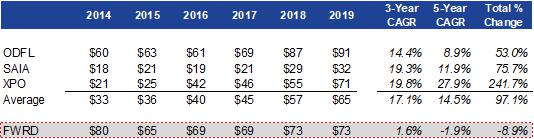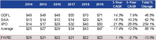 This stark contrast in operating performance is best exemplified by looking at EBIT on a per ton and per shipment basis as shown in the tables below. On average, LTL peers were able to nearly double EBIT on a per ton/shipment basis over the past five years given their ability to capitalize on a strong fundamental backdrop. LTL peers executed well by containing costs, taking price above cost inflation, increasing density in their networks and purging unprofitable freight that either was not operating at a sufficient OR level or did not appropriately fit into their networks. On the other hand, Forward Air’s core Expedited LTL business saw EBIT per ton/shipment decline over the past five years. EBIT per ton decreased ~9% and EBIT per shipment decreased ~13%.