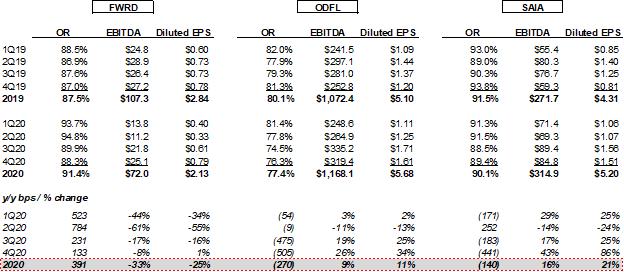 Forward Air’s FY 2020 results have substantially underperformed LTL peers as the core Expedited LTL OR has deteriorated ~400 bps year-over-year with EBITDA down ~35% year-over-year and diluted EPS (ex-Pool Distribution) down ~25% year-over-year. Meanwhile, LTL peers Old Dominion and Saia have experienced year-over-year improvement in ORs (to record levels), EBITDA and EPS in FY 2020.