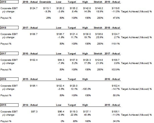 The table below shows the Company’s STI targets, actual results and the percentage pay-out management received over the past five years. Three out of the past five years (2015, 2016, 2019), management missed the target annual EBIT goal by >10% but still got paid a substantial portion of their annual cash bonus. Ancora believes this type of goal setting is unacceptable and appears to align more with the interests of management than those of shareholders.