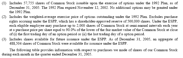 Employee Stock Purchase Plan The Company implemented an employee stock purchase plan effective May 26, 2005 (the ESPP) at which time participating employees became entitled to purchase common stock through payroll deduction of up to 10.0% of the employees annual compensation. Under the ESPP, each eligible employee may purchase up to 2,000 shares of common stock at semi-annual intervals each year at an issue price equal to the lesser of (1) 90.0% of market price on the first trading day of the semi-annual option period or (2) 90.0% of market price on the last trading day of the semi-annual option period. The Company has reserved 500,000 shares of common stock for issuance pursuant to the ESPP. At December 31, 2005, 11,496 shares had been issued under the ESPP.