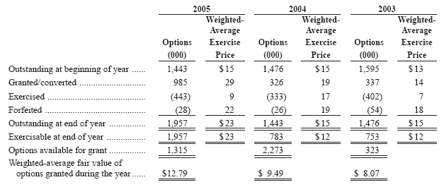 for these options was estimated at the date of grant using a Black-Scholes option pricing model with the following weighted-average assumptions for 2005, 2004 and 2003, respectively: risk-free interest rates of 4.0%, 3.7% and 3.7%; dividend yields of 0.8%, 0.0% and 0.0%; volatility factors of the expected market price of the common stock of 0.4, 0.4 and 0.5; and a weighted-average expected life of the option of seven years.