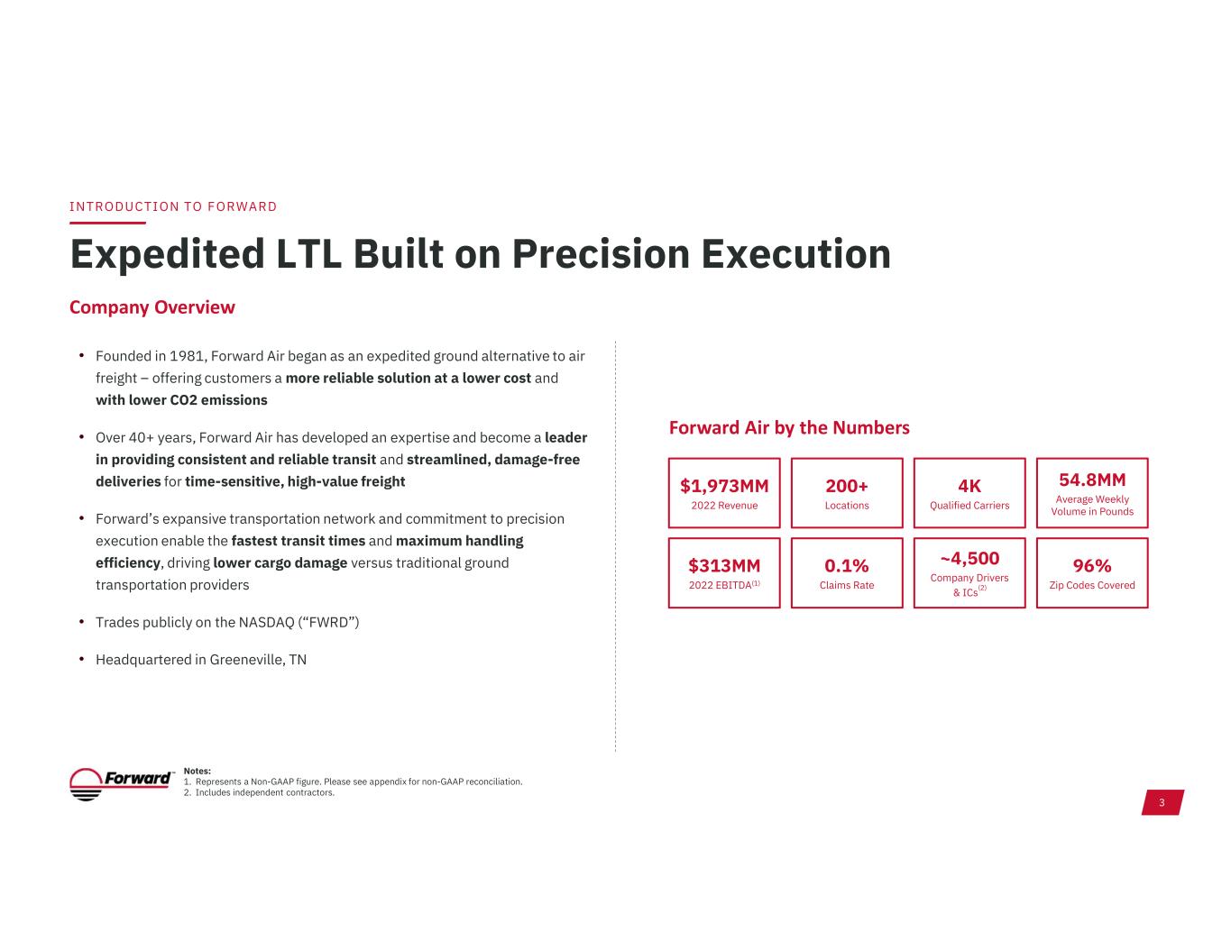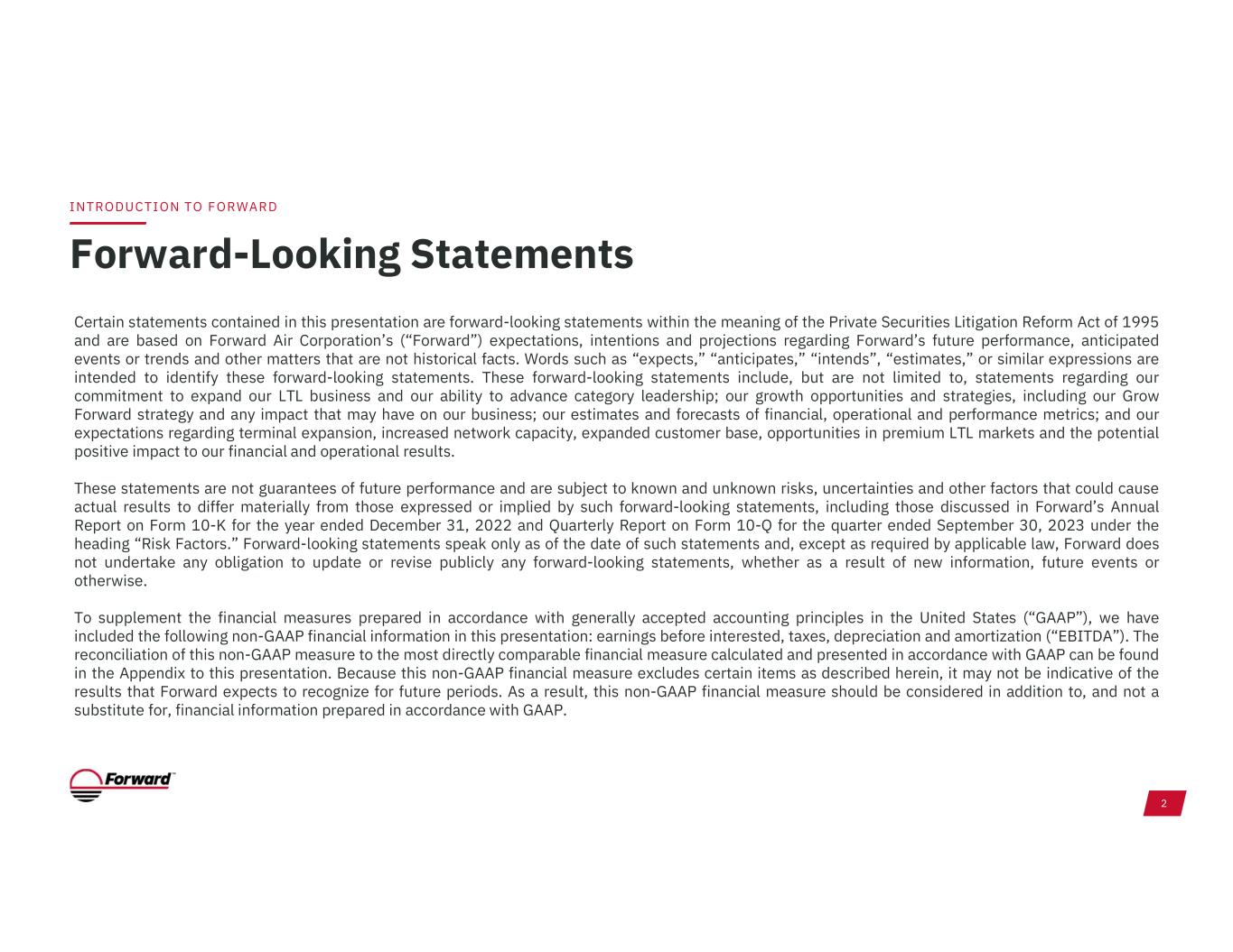 2 INTRODUCTION TO FORWARD Forward-Looking Statements Certain statements contained in this presentation are forward-looking statements within the meaning of the Private Securities Litigation Reform Act of 1995 and are based on Forward Air Corporation’s (“Forward”) expectations, intentions and projections regarding Forward’s future performance, anticipated events or trends and other matters that are not historical facts. Words such as “expects,” “anticipates,” “intends”, “estimates,” or similar expressions are intended to identify these forward-looking statements. These forward-looking statements include, but are not limited to, statements regarding our commitment to expand our LTL business and our ability to advance category leadership; our growth opportunities and strategies, including our Grow Forward strategy and any impact that may have on our business; our estimates and forecasts of financial, operational and performance metrics; and our expectations regarding terminal expansion, increased network capacity, expanded customer base, opportunities in premium LTL markets and the potential positive impact to our financial and operational results. These statements are not guarantees of future performance and are subject to known and unknown risks, uncertainties and other factors that could cause actual results to differ materially from those expressed or implied by such forward-looking statements, including those discussed in Forward’s Annual Report on Form 10-K for the year ended December 31, 2022 and Quarterly Report on Form 10-Q for the quarter ended September 30, 2023 under the heading “Risk Factors.” Forward-looking statements speak only as of the date of such statements and, except as required by applicable law, Forward does not undertake any obligation to update or revise publicly any forward-looking statements, whether as a result of new information, future events or otherwise. To supplement the financial measures prepared in accordance with generally accepted accounting principles in the United States (“GAAP”), we have included the following non-GAAP financial information in this presentation: earnings before interested, taxes, depreciation and amortization (“EBITDA”). The reconciliation of this non-GAAP measure to the most directly comparable financial measure calculated and presented in accordance with GAAP can be found in the Appendix to this presentation. Because this non-GAAP financial measure excludes certain items as described herein, it may not be indicative of the results that Forward expects to recognize for future periods. As a result, this non-GAAP financial measure should be considered in addition to, and not a substitute for, financial information prepared in accordance with GAAP.