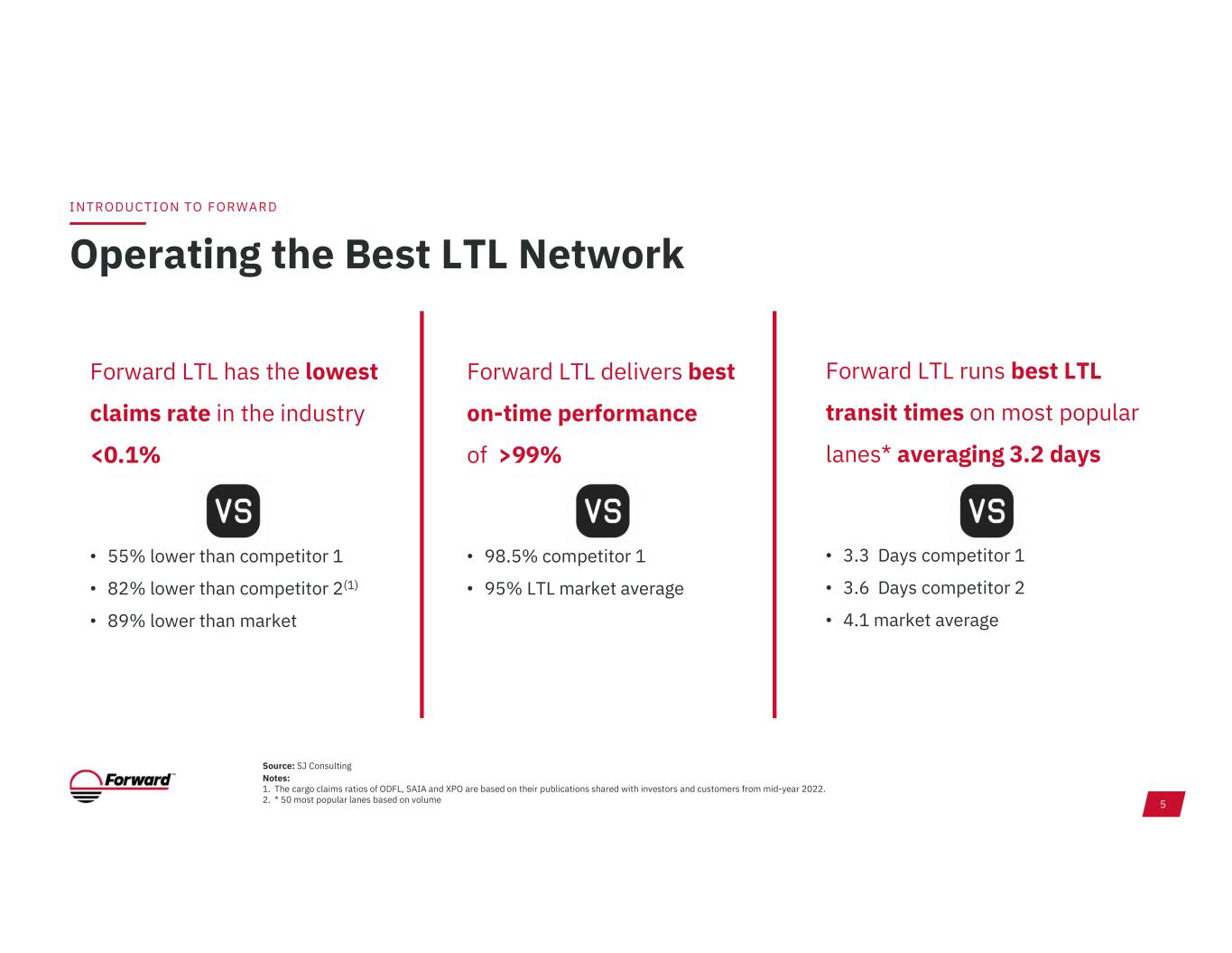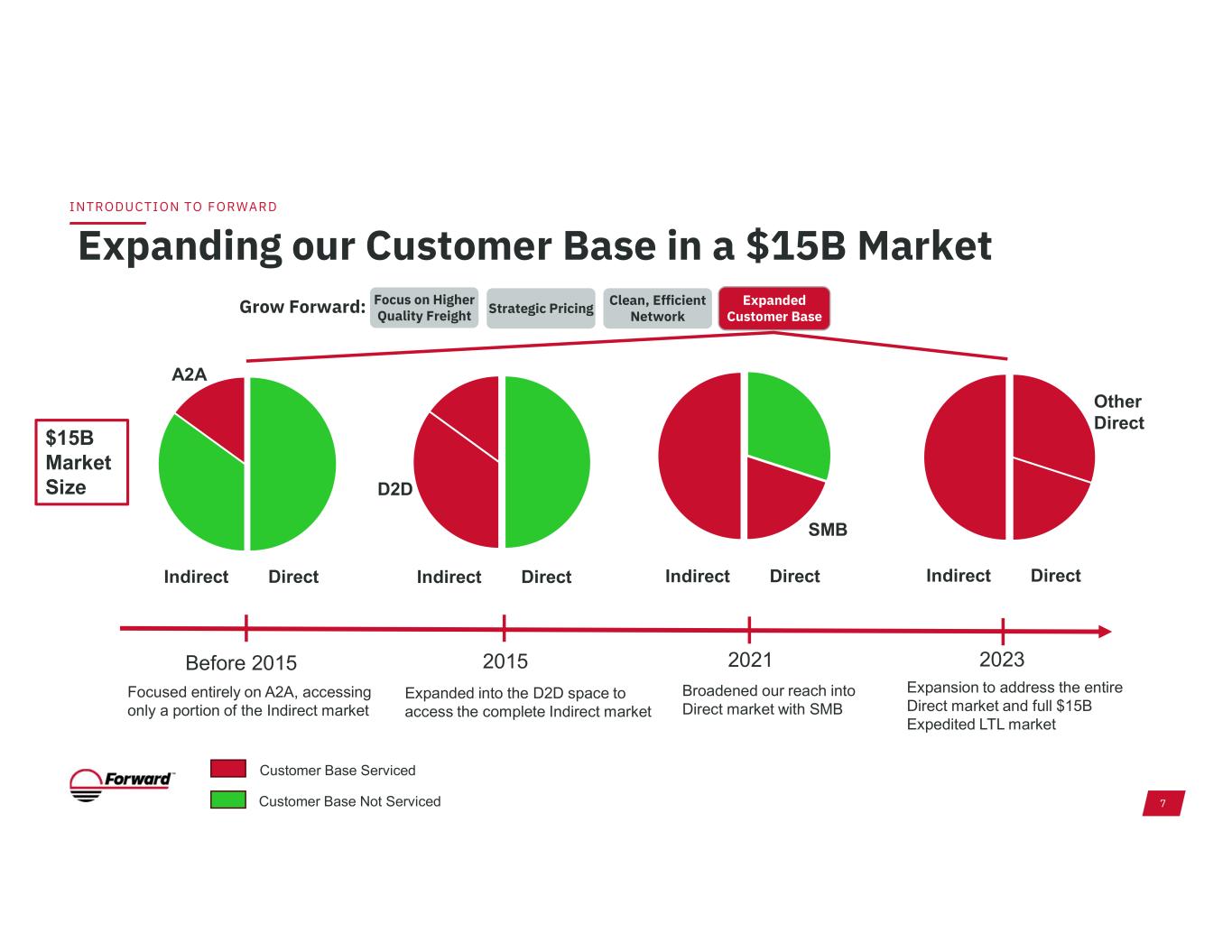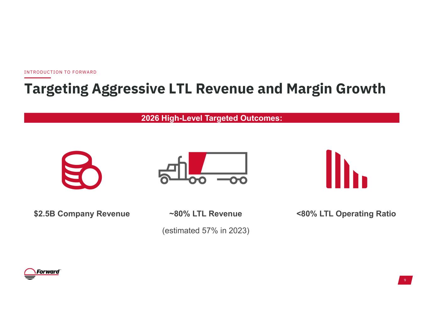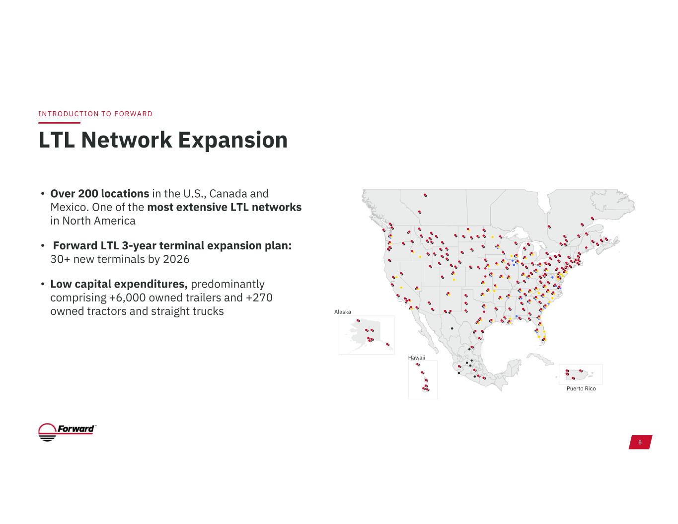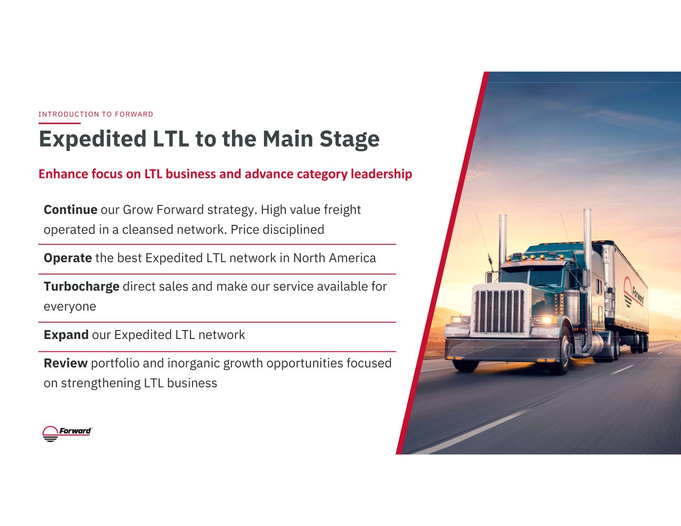 INTRODUCTION TO FORWARD Expedited LTL to the Main Stage Continue our Grow Forward strategy. High value freight operated in a cleansed network. Price disciplined Operate the best Expedited LTL network in North America Turbocharge direct sales and make our service available for everyone Expand our Expedited LTL network Review portfolio and inorganic growth opportunities focused on strengthening LTL business Enhance focus on LTL business and advance category leadership