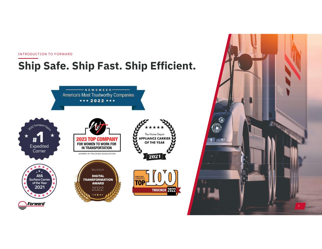 5 INTRODUCTION TO FORWARD Operating the Best LTL Network Forward LTL has the lowest claims rate in the industry <0.1% • 55% lower than competitor 1 • 82% lower than competitor 2(1) • 89% lower than market Notes: 1. The cargo claims ratios of ODFL, SAIA and XPO are based on their publications shared with investors and customers from mid-year 2022. 2. * 50 most popular lanes based on volume Source: SJ Consulting Forward LTL delivers best on-time performance of >99% • 98.5% competitor 1 • 95% LTL market average Forward LTL runs best LTL transit times on most popular lanes* averaging 3.2 days • 3.3 Days competitor 1 • 3.6 Days competitor 2 • 4.1 market average
