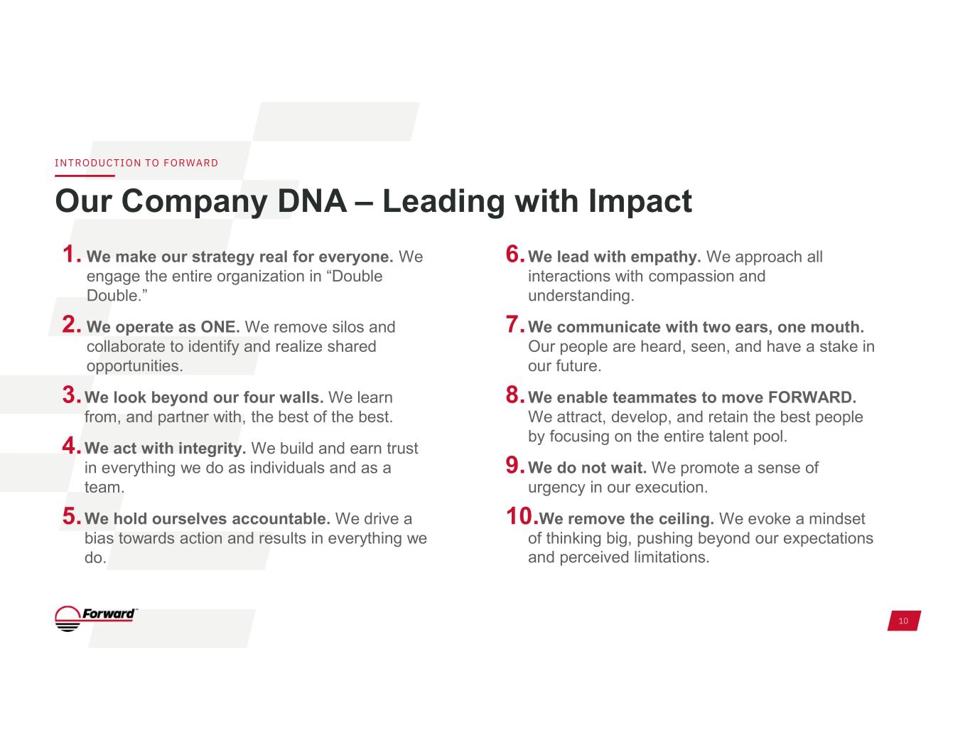 10 Our Company DNA – Leading with Impact 1. We make our strategy real for everyone. We engage the entire organization in “Double Double.” 2. We operate as ONE. We remove silos and collaborate to identify and realize shared opportunities. 3.We look beyond our four walls. We learn from, and partner with, the best of the best. 4.We act with integrity. We build and earn trust in everything we do as individuals and as a team. 5.We hold ourselves accountable. We drive a bias towards action and results in everything we do. 6.We lead with empathy. We approach all interactions with compassion and understanding. 7.We communicate with two ears, one mouth. Our people are heard, seen, and have a stake in our future. 8.We enable teammates to move FORWARD. We attract, develop, and retain the best people by focusing on the entire talent pool. 9.We do not wait. We promote a sense of urgency in our execution. 10.We remove the ceiling. We evoke a mindset of thinking big, pushing beyond our expectations and perceived limitations. INTRODUCTION TO FORWARD