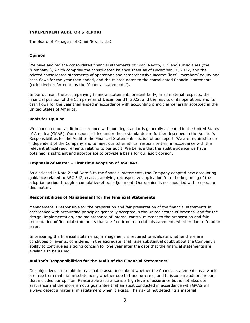 2 OMNI NEWCO, LLC AND SUBSIDIARIES Table of Contents Page Independent Auditors Report 3-4 Consolidated Financial Statements Consolidated Balance Sheet as of December 31, 2022 5 Consolidated Statement of Operations and Comprehensive Income for the Year Ended December 31, 2022 6 Consolidated Statement of Members’ Equity for the Year Ended December 31, 2022 7 Consolidated Statement of Cash Flows for Year Ended December 31, 2022 8 Notes to Consolidated Financial Statements 9-25