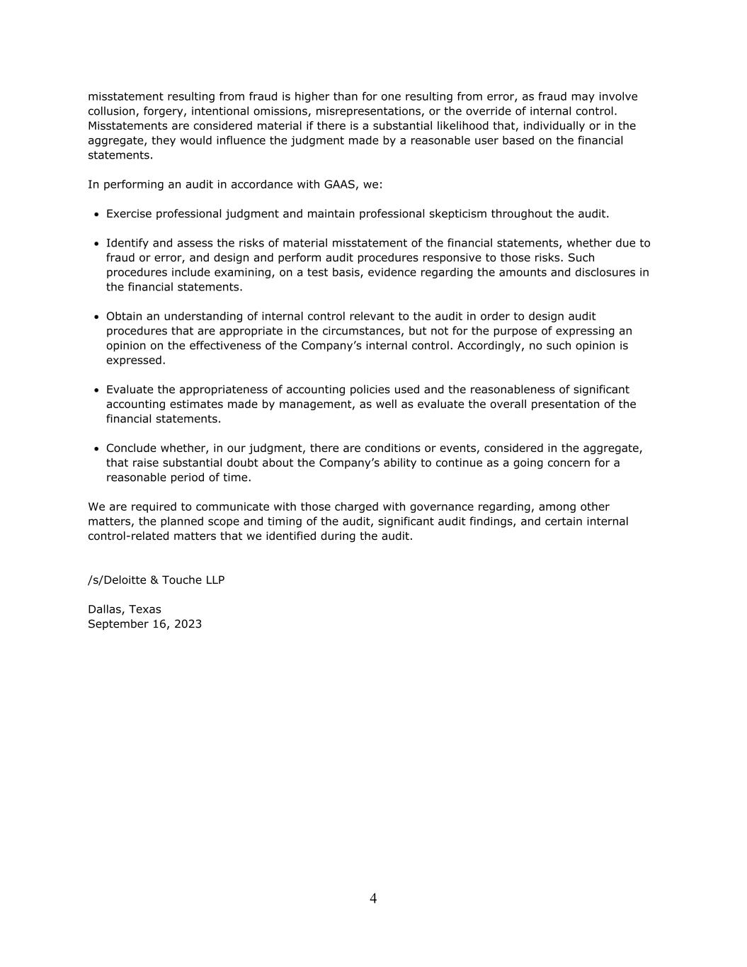 4 misstatement resulting from fraud is higher than for one resulting from error, as fraud may involve collusion, forgery, intentional omissions, misrepresentations, or the override of internal control. Misstatements are considered material if there is a substantial likelihood that, individually or in the aggregate, they would influence the judgment made by a reasonable user based on the financial statements. In performing an audit in accordance with GAAS, we: Exercise professional judgment and maintain professional skepticism throughout the audit. Identify and assess the risks of material misstatement of the financial statements, whether due to fraud or error, and design and perform audit procedures responsive to those risks. Such procedures include examining, on a test basis, evidence regarding the amounts and disclosures in the financial statements. Obtain an understanding of internal control relevant to the audit in order to design audit procedures that are appropriate in the circumstances, but not for the purpose of expressing an opinion on the effectiveness of the Company’s internal control. Accordingly, no such opinion is expressed. Evaluate the appropriateness of accounting policies used and the reasonableness of significant accounting estimates made by management, as well as evaluate the overall presentation of the financial statements. Conclude whether, in our judgment, there are conditions or events, considered in the aggregate, that raise substantial doubt about the Company’s ability to continue as a going concern for a reasonable period of time. We are required to communicate with those charged with governance regarding, among other matters, the planned scope and timing of the audit, significant audit findings, and certain internal control-related matters that we identified during the audit. /s/Deloitte & Touche LLP Dallas, Texas September 16, 2023