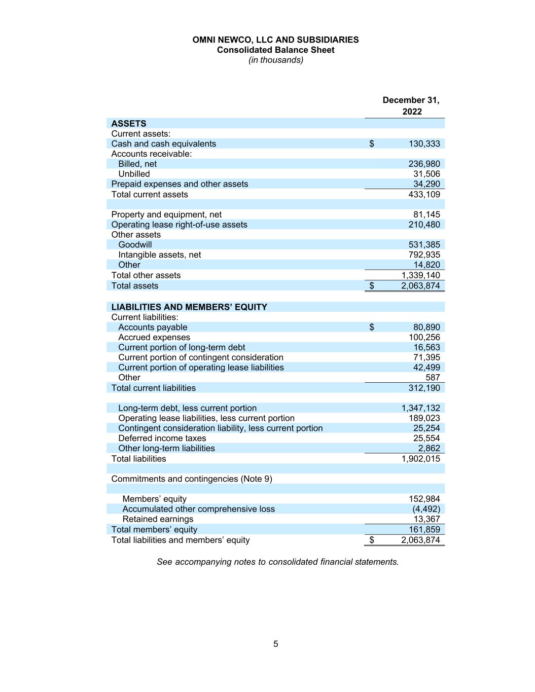 OMNI NEWCO, LLC AND SUBSIDIARIES Consolidated Balance Sheet (in thousands) 5 December 31, 2022 ASSETS Current assets: Cash and cash equivalents $ 130,333 Accounts receivable: Billed, net 236,980 Unbilled 31,506 Prepaid expenses and other assets 34,290 Total current assets 433,109 Property and equipment, net 81,145 Operating lease right-of-use assets 210,480 Other assets Goodwill 531,385 Intangible assets, net 792,935 Other 14,820 Total other assets 1,339,140 Total assets $ 2,063,874 LIABILITIES AND MEMBERS’ EQUITY Current liabilities: Accounts payable $ 80,890 Accrued expenses 100,256 Current portion of long-term debt 16,563 Current portion of contingent consideration 71,395 Current portion of operating lease liabilities 42,499 Other 587 Total current liabilities 312,190 Long-term debt, less current portion 1,347,132 Operating lease liabilities, less current portion 189,023 Contingent consideration liability, less current portion 25,254 Deferred income taxes 25,554 Other long-term liabilities 2,862 Total liabilities 1,902,015 Commitments and contingencies (Note 9) Members’ equity 152,984 Accumulated other comprehensive loss (4,492) Retained earnings 13,367 Total members’ equity 161,859 Total liabilities and members’ equity $ 2,063,874 See accompanying notes to consolidated financial statements.
