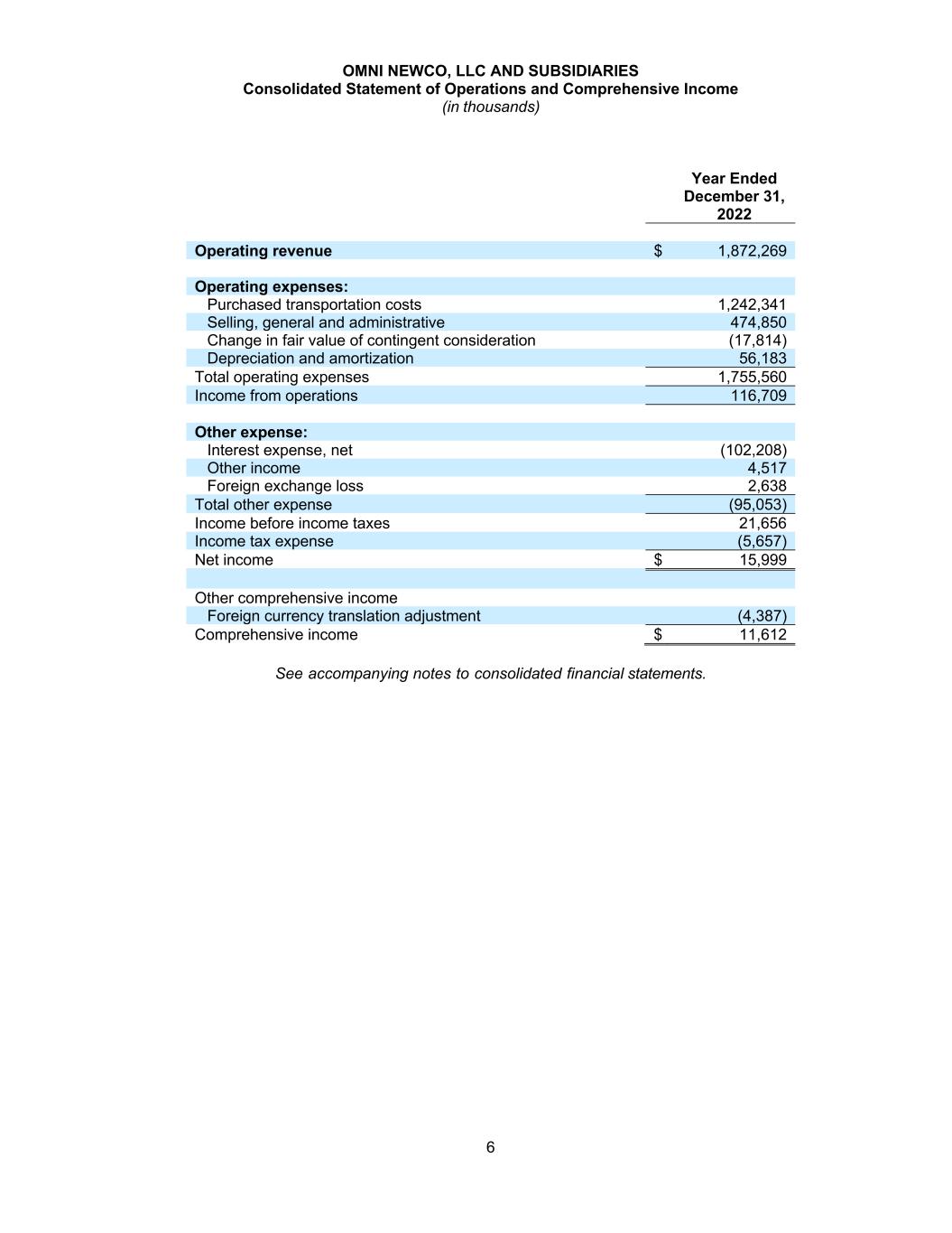 OMNI NEWCO, LLC AND SUBSIDIARIES Consolidated Statement of Operations and Comprehensive Income (in thousands) 6 Year Ended December 31, 2022 Operating revenue $ 1,872,269 Operating expenses: Purchased transportation costs 1,242,341 Selling, general and administrative 474,850 Change in fair value of contingent consideration (17,814) Depreciation and amortization 56,183 Total operating expenses 1,755,560 Income from operations 116,709 Other expense: Interest expense, net (102,208) Other income 4,517 Foreign exchange loss 2,638 Total other expense (95,053) Income before income taxes 21,656 Income tax expense (5,657) Net income $ 15,999 Other comprehensive income Foreign currency translation adjustment (4,387) Comprehensive income $ 11,612 See accompanying notes to consolidated financial statements.
