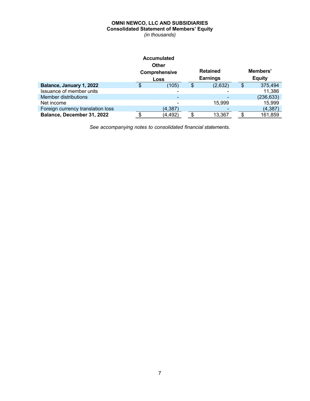 OMNI NEWCO, LLC AND SUBSIDIARIES Consolidated Statement of Members’ Equity (in thousands) 7 Accumulated Other Comprehensive Loss Retained Earnings Members’ Equity Balance, January 1, 2022 $ (105) $ (2,632) $ 375,494 Issuance of member units - - 11,386 Member distributions - - (236,633) Net income - 15,999 15,999 Foreign currency translation loss (4,387) - (4,387) Balance, December 31, 2022 $ (4,492) $ 13,367 $ 161,859 See accompanying notes to consolidated financial statements.