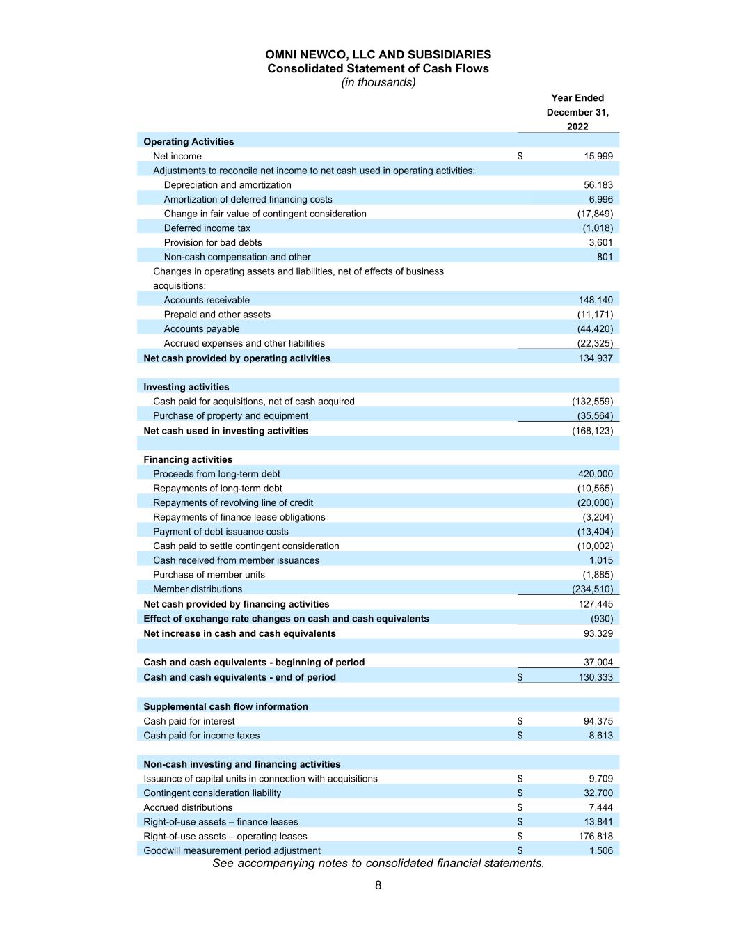 OMNI NEWCO, LLC AND SUBSIDIARIES Consolidated Statement of Cash Flows (in thousands) 8 Year Ended December 31, 2022 Operating Activities Net income $ 15,999 Adjustments to reconcile net income to net cash used in operating activities: Depreciation and amortization 56,183 Amortization of deferred financing costs 6,996 Change in fair value of contingent consideration (17,849) Deferred income tax (1,018) Provision for bad debts 3,601 Non-cash compensation and other 801 Changes in operating assets and liabilities, net of effects of business acquisitions: Accounts receivable 148,140 Prepaid and other assets (11,171) Accounts payable (44,420) Accrued expenses and other liabilities (22,325) Net cash provided by operating activities 134,937 Investing activities Cash paid for acquisitions, net of cash acquired (132,559) Purchase of property and equipment (35,564) Net cash used in investing activities (168,123) Financing activities Proceeds from long-term debt 420,000 Repayments of long-term debt (10,565) Repayments of revolving line of credit (20,000) Repayments of finance lease obligations (3,204) Payment of debt issuance costs (13,404) Cash paid to settle contingent consideration (10,002) Cash received from member issuances 1,015 Purchase of member units (1,885) Member distributions (234,510) Net cash provided by financing activities 127,445 Effect of exchange rate changes on cash and cash equivalents (930) Net increase in cash and cash equivalents 93,329 Cash and cash equivalents - beginning of period 37,004 Cash and cash equivalents - end of period $ 130,333 Supplemental cash flow information Cash paid for interest $ 94,375 Cash paid for income taxes $ 8,613 Non-cash investing and financing activities Issuance of capital units in connection with acquisitions $ 9,709 Contingent consideration liability $ 32,700 Accrued distributions $ 7,444 Right-of-use assets – finance leases $ 13,841 Right-of-use assets – operating leases $ 176,818 Goodwill measurement period adjustment $ 1,506 See accompanying notes to consolidated financial statements.