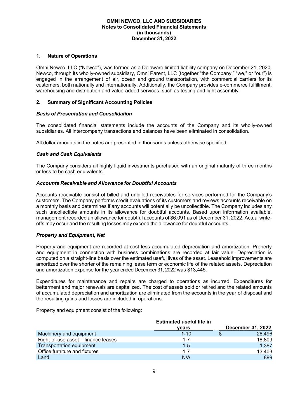 OMNI NEWCO, LLC AND SUBSIDIARIES Notes to Consolidated Financial Statements (in thousands) December 31, 2022 9 1. Nature of Operations Omni Newco, LLC (“Newco”), was formed as a Delaware limited liability company on December 21, 2020. Newco, through its wholly-owned subsidiary, Omni Parent, LLC (together “the Company,” “we,” or “our”) is engaged in the arrangement of air, ocean and ground transportation, with commercial carriers for its customers, both nationally and internationally. Additionally, the Company provides e-commerce fulfillment, warehousing and distribution and value-added services, such as testing and light assembly. 2. Summary of Significant Accounting Policies Basis of Presentation and Consolidation The consolidated financial statements include the accounts of the Company and its wholly-owned subsidiaries. All intercompany transactions and balances have been eliminated in consolidation. All dollar amounts in the notes are presented in thousands unless otherwise specified. Cash and Cash Equivalents The Company considers all highly liquid investments purchased with an original maturity of three months or less to be cash equivalents. Accounts Receivable and Allowance for Doubtful Accounts Accounts receivable consist of billed and unbilled receivables for services performed for the Company’s customers. The Company performs credit evaluations of its customers and reviews accounts receivable on a monthly basis and determines if any accounts will potentially be uncollectible. The Company includes any such uncollectible amounts in its allowance for doubtful accounts. Based upon information available, management recorded an allowance for doubtful accounts of $6,091 as of December 31, 2022. Actual write- offs may occur and the resulting losses may exceed the allowance for doubtful accounts. Property and Equipment, Net Property and equipment are recorded at cost less accumulated depreciation and amortization. Property and equipment in connection with business combinations are recorded at fair value. Depreciation is computed on a straight-line basis over the estimated useful lives of the asset. Leasehold improvements are amortized over the shorter of the remaining lease term or economic life of the related assets. Depreciation and amortization expense for the year ended December 31, 2022 was $13,445. Expenditures for maintenance and repairs are charged to operations as incurred. Expenditures for betterment and major renewals are capitalized. The cost of assets sold or retired and the related amounts of accumulated depreciation and amortization are eliminated from the accounts in the year of disposal and the resulting gains and losses are included in operations. Property and equipment consist of the following: Estimated useful life in years December 31, 2022 Machinery and equipment 1-10 $ 28,496 Right-of-use asset – finance leases 1-7 18,809 Transportation equipment 1-5 1,387 Office furniture and fixtures 1-7 13,403 Land N/A 899