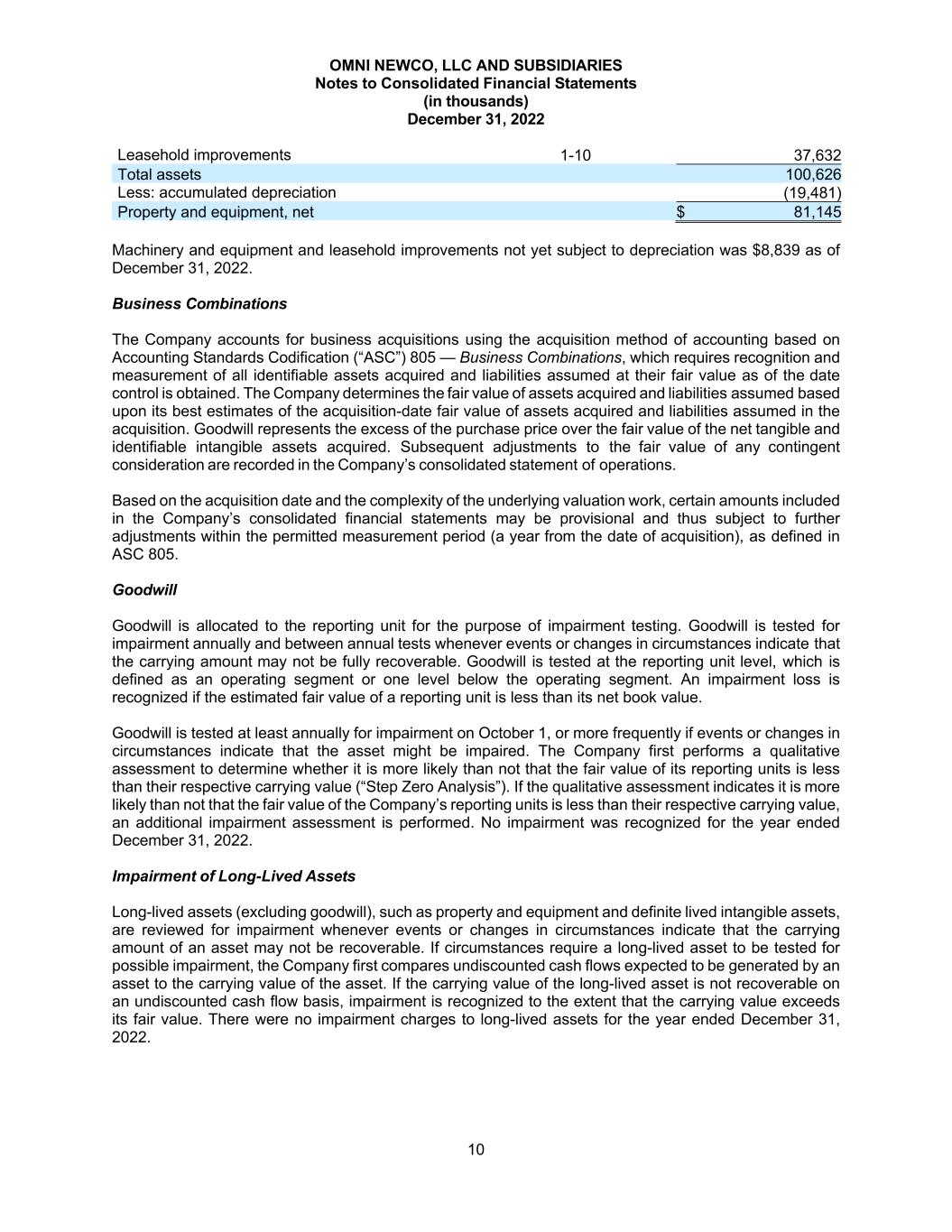 OMNI NEWCO, LLC AND SUBSIDIARIES Notes to Consolidated Financial Statements (in thousands) December 31, 2022 10 Leasehold improvements 1-10 37,632 Total assets 100,626 Less: accumulated depreciation (19,481) Property and equipment, net $ 81,145 Machinery and equipment and leasehold improvements not yet subject to depreciation was $8,839 as of December 31, 2022. Business Combinations The Company accounts for business acquisitions using the acquisition method of accounting based on Accounting Standards Codification (“ASC”) 805 — Business Combinations, which requires recognition and measurement of all identifiable assets acquired and liabilities assumed at their fair value as of the date control is obtained. The Company determines the fair value of assets acquired and liabilities assumed based upon its best estimates of the acquisition-date fair value of assets acquired and liabilities assumed in the acquisition. Goodwill represents the excess of the purchase price over the fair value of the net tangible and identifiable intangible assets acquired. Subsequent adjustments to the fair value of any contingent consideration are recorded in the Company’s consolidated statement of operations. Based on the acquisition date and the complexity of the underlying valuation work, certain amounts included in the Company’s consolidated financial statements may be provisional and thus subject to further adjustments within the permitted measurement period (a year from the date of acquisition), as defined in ASC 805. Goodwill Goodwill is allocated to the reporting unit for the purpose of impairment testing. Goodwill is tested for impairment annually and between annual tests whenever events or changes in circumstances indicate that the carrying amount may not be fully recoverable. Goodwill is tested at the reporting unit level, which is defined as an operating segment or one level below the operating segment. An impairment loss is recognized if the estimated fair value of a reporting unit is less than its net book value. Goodwill is tested at least annually for impairment on October 1, or more frequently if events or changes in circumstances indicate that the asset might be impaired. The Company first performs a qualitative assessment to determine whether it is more likely than not that the fair value of its reporting units is less than their respective carrying value (“Step Zero Analysis”). If the qualitative assessment indicates it is more likely than not that the fair value of the Company’s reporting units is less than their respective carrying value, an additional impairment assessment is performed. No impairment was recognized for the year ended December 31, 2022. Impairment of Long-Lived Assets Long-lived assets (excluding goodwill), such as property and equipment and definite lived intangible assets, are reviewed for impairment whenever events or changes in circumstances indicate that the carrying amount of an asset may not be recoverable. If circumstances require a long-lived asset to be tested for possible impairment, the Company first compares undiscounted cash flows expected to be generated by an asset to the carrying value of the asset. If the carrying value of the long-lived asset is not recoverable on an undiscounted cash flow basis, impairment is recognized to the extent that the carrying value exceeds its fair value. There were no impairment charges to long-lived assets for the year ended December 31, 2022.
