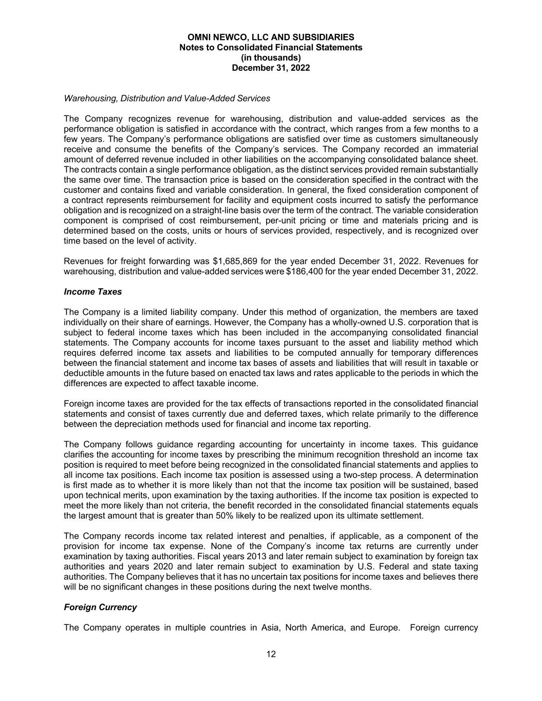 OMNI NEWCO, LLC AND SUBSIDIARIES Notes to Consolidated Financial Statements (in thousands) December 31, 2022 12 Warehousing, Distribution and Value-Added Services The Company recognizes revenue for warehousing, distribution and value-added services as the performance obligation is satisfied in accordance with the contract, which ranges from a few months to a few years. The Company’s performance obligations are satisfied over time as customers simultaneously receive and consume the benefits of the Company’s services. The Company recorded an immaterial amount of deferred revenue included in other liabilities on the accompanying consolidated balance sheet. The contracts contain a single performance obligation, as the distinct services provided remain substantially the same over time. The transaction price is based on the consideration specified in the contract with the customer and contains fixed and variable consideration. In general, the fixed consideration component of a contract represents reimbursement for facility and equipment costs incurred to satisfy the performance obligation and is recognized on a straight-line basis over the term of the contract. The variable consideration component is comprised of cost reimbursement, per-unit pricing or time and materials pricing and is determined based on the costs, units or hours of services provided, respectively, and is recognized over time based on the level of activity. Revenues for freight forwarding was $1,685,869 for the year ended December 31, 2022. Revenues for warehousing, distribution and value-added services were $186,400 for the year ended December 31, 2022. Income Taxes The Company is a limited liability company. Under this method of organization, the members are taxed individually on their share of earnings. However, the Company has a wholly-owned U.S. corporation that is subject to federal income taxes which has been included in the accompanying consolidated financial statements. The Company accounts for income taxes pursuant to the asset and liability method which requires deferred income tax assets and liabilities to be computed annually for temporary differences between the financial statement and income tax bases of assets and liabilities that will result in taxable or deductible amounts in the future based on enacted tax laws and rates applicable to the periods in which the differences are expected to affect taxable income. Foreign income taxes are provided for the tax effects of transactions reported in the consolidated financial statements and consist of taxes currently due and deferred taxes, which relate primarily to the difference between the depreciation methods used for financial and income tax reporting. The Company follows guidance regarding accounting for uncertainty in income taxes. This guidance clarifies the accounting for income taxes by prescribing the minimum recognition threshold an income tax position is required to meet before being recognized in the consolidated financial statements and applies to all income tax positions. Each income tax position is assessed using a two-step process. A determination is first made as to whether it is more likely than not that the income tax position will be sustained, based upon technical merits, upon examination by the taxing authorities. If the income tax position is expected to meet the more likely than not criteria, the benefit recorded in the consolidated financial statements equals the largest amount that is greater than 50% likely to be realized upon its ultimate settlement. The Company records income tax related interest and penalties, if applicable, as a component of the provision for income tax expense. None of the Company’s income tax returns are currently under examination by taxing authorities. Fiscal years 2013 and later remain subject to examination by foreign tax authorities and years 2020 and later remain subject to examination by U.S. Federal and state taxing authorities. The Company believes that it has no uncertain tax positions for income taxes and believes there will be no significant changes in these positions during the next twelve months. Foreign Currency The Company operates in multiple countries in Asia, North America, and Europe. Foreign currency
