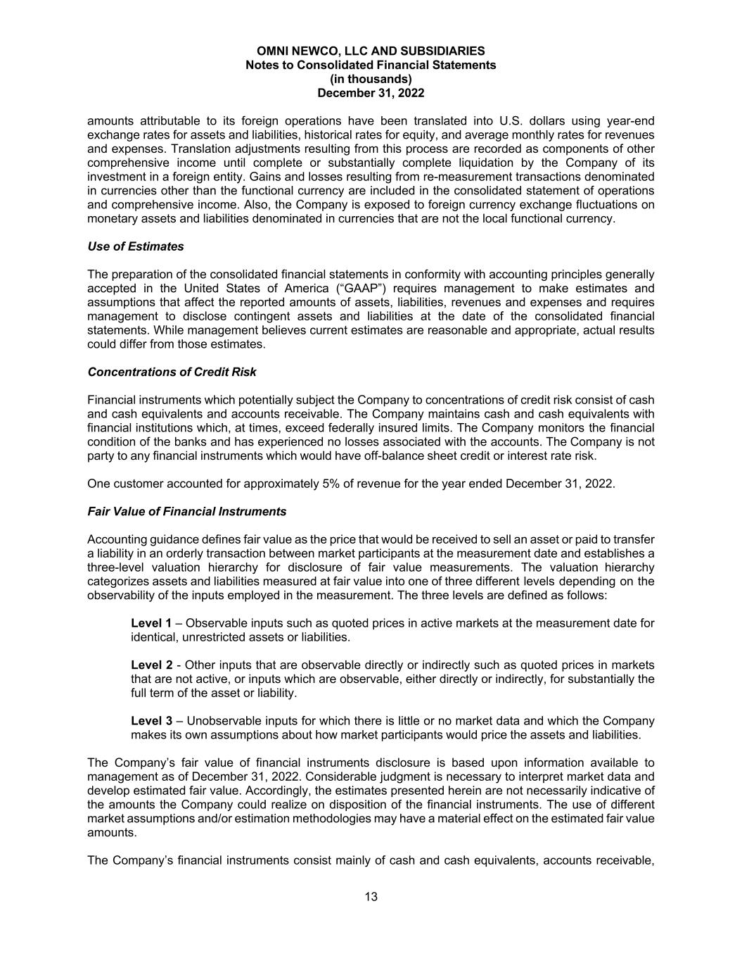 OMNI NEWCO, LLC AND SUBSIDIARIES Notes to Consolidated Financial Statements (in thousands) December 31, 2022 13 amounts attributable to its foreign operations have been translated into U.S. dollars using year-end exchange rates for assets and liabilities, historical rates for equity, and average monthly rates for revenues and expenses. Translation adjustments resulting from this process are recorded as components of other comprehensive income until complete or substantially complete liquidation by the Company of its investment in a foreign entity. Gains and losses resulting from re-measurement transactions denominated in currencies other than the functional currency are included in the consolidated statement of operations and comprehensive income. Also, the Company is exposed to foreign currency exchange fluctuations on monetary assets and liabilities denominated in currencies that are not the local functional currency. Use of Estimates The preparation of the consolidated financial statements in conformity with accounting principles generally accepted in the United States of America (“GAAP”) requires management to make estimates and assumptions that affect the reported amounts of assets, liabilities, revenues and expenses and requires management to disclose contingent assets and liabilities at the date of the consolidated financial statements. While management believes current estimates are reasonable and appropriate, actual results could differ from those estimates. Concentrations of Credit Risk Financial instruments which potentially subject the Company to concentrations of credit risk consist of cash and cash equivalents and accounts receivable. The Company maintains cash and cash equivalents with financial institutions which, at times, exceed federally insured limits. The Company monitors the financial condition of the banks and has experienced no losses associated with the accounts. The Company is not party to any financial instruments which would have off-balance sheet credit or interest rate risk. One customer accounted for approximately 5% of revenue for the year ended December 31, 2022. Fair Value of Financial Instruments Accounting guidance defines fair value as the price that would be received to sell an asset or paid to transfer a liability in an orderly transaction between market participants at the measurement date and establishes a three-level valuation hierarchy for disclosure of fair value measurements. The valuation hierarchy categorizes assets and liabilities measured at fair value into one of three different levels depending on the observability of the inputs employed in the measurement. The three levels are defined as follows: Level 1 – Observable inputs such as quoted prices in active markets at the measurement date for identical, unrestricted assets or liabilities. Level 2 - Other inputs that are observable directly or indirectly such as quoted prices in markets that are not active, or inputs which are observable, either directly or indirectly, for substantially the full term of the asset or liability. Level 3 – Unobservable inputs for which there is little or no market data and which the Company makes its own assumptions about how market participants would price the assets and liabilities. The Company’s fair value of financial instruments disclosure is based upon information available to management as of December 31, 2022. Considerable judgment is necessary to interpret market data and develop estimated fair value. Accordingly, the estimates presented herein are not necessarily indicative of the amounts the Company could realize on disposition of the financial instruments. The use of different market assumptions and/or estimation methodologies may have a material effect on the estimated fair value amounts. The Company’s financial instruments consist mainly of cash and cash equivalents, accounts receivable,