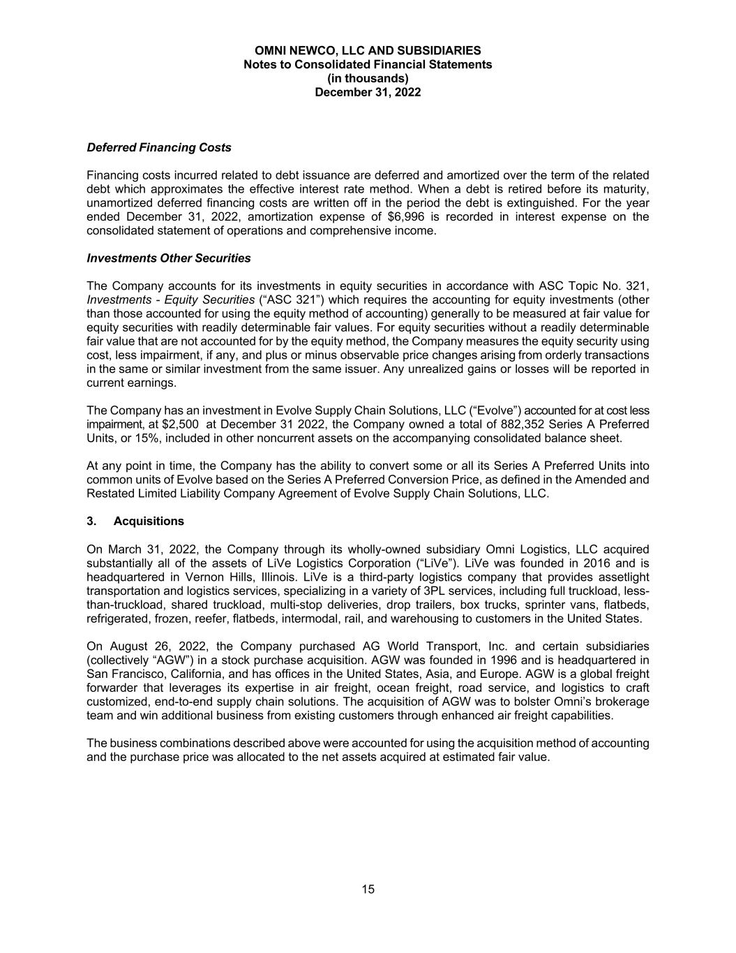 OMNI NEWCO, LLC AND SUBSIDIARIES Notes to Consolidated Financial Statements (in thousands) December 31, 2022 15 Deferred Financing Costs Financing costs incurred related to debt issuance are deferred and amortized over the term of the related debt which approximates the effective interest rate method. When a debt is retired before its maturity, unamortized deferred financing costs are written off in the period the debt is extinguished. For the year ended December 31, 2022, amortization expense of $6,996 is recorded in interest expense on the consolidated statement of operations and comprehensive income. Investments Other Securities The Company accounts for its investments in equity securities in accordance with ASC Topic No. 321, Investments - Equity Securities (“ASC 321”) which requires the accounting for equity investments (other than those accounted for using the equity method of accounting) generally to be measured at fair value for equity securities with readily determinable fair values. For equity securities without a readily determinable fair value that are not accounted for by the equity method, the Company measures the equity security using cost, less impairment, if any, and plus or minus observable price changes arising from orderly transactions in the same or similar investment from the same issuer. Any unrealized gains or losses will be reported in current earnings. The Company has an investment in Evolve Supply Chain Solutions, LLC (“Evolve”) accounted for at cost less impairment, at $2,500 at December 31 2022, the Company owned a total of 882,352 Series A Preferred Units, or 15%, included in other noncurrent assets on the accompanying consolidated balance sheet. At any point in time, the Company has the ability to convert some or all its Series A Preferred Units into common units of Evolve based on the Series A Preferred Conversion Price, as defined in the Amended and Restated Limited Liability Company Agreement of Evolve Supply Chain Solutions, LLC. 3. Acquisitions On March 31, 2022, the Company through its wholly-owned subsidiary Omni Logistics, LLC acquired substantially all of the assets of LiVe Logistics Corporation (“LiVe”). LiVe was founded in 2016 and is headquartered in Vernon Hills, Illinois. LiVe is a third-party logistics company that provides assetlight transportation and logistics services, specializing in a variety of 3PL services, including full truckload, less- than-truckload, shared truckload, multi-stop deliveries, drop trailers, box trucks, sprinter vans, flatbeds, refrigerated, frozen, reefer, flatbeds, intermodal, rail, and warehousing to customers in the United States. On August 26, 2022, the Company purchased AG World Transport, Inc. and certain subsidiaries (collectively “AGW”) in a stock purchase acquisition. AGW was founded in 1996 and is headquartered in San Francisco, California, and has offices in the United States, Asia, and Europe. AGW is a global freight forwarder that leverages its expertise in air freight, ocean freight, road service, and logistics to craft customized, end-to-end supply chain solutions. The acquisition of AGW was to bolster Omni’s brokerage team and win additional business from existing customers through enhanced air freight capabilities. The business combinations described above were accounted for using the acquisition method of accounting and the purchase price was allocated to the net assets acquired at estimated fair value.