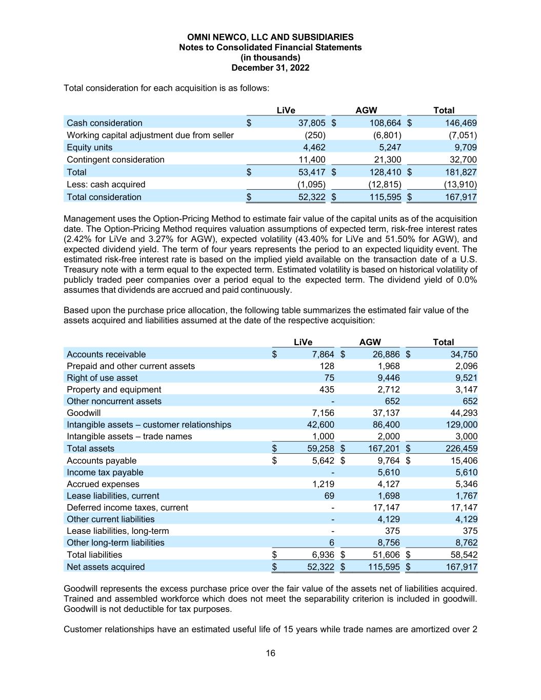 OMNI NEWCO, LLC AND SUBSIDIARIES Notes to Consolidated Financial Statements (in thousands) December 31, 2022 16 Total consideration for each acquisition is as follows: LiVe AGW Total Cash consideration $ 37,805 $ 108,664 $ 146,469 Working capital adjustment due from seller (250) (6,801) (7,051) Equity units 4,462 5,247 9,709 Contingent consideration 11,400 21,300 32,700 Total $ 53,417 $ 128,410 $ 181,827 Less: cash acquired (1,095) (12,815) (13,910) Total consideration $ 52,322 $ 115,595 $ 167,917 Management uses the Option-Pricing Method to estimate fair value of the capital units as of the acquisition date. The Option-Pricing Method requires valuation assumptions of expected term, risk-free interest rates (2.42% for LiVe and 3.27% for AGW), expected volatility (43.40% for LiVe and 51.50% for AGW), and expected dividend yield. The term of four years represents the period to an expected liquidity event. The estimated risk-free interest rate is based on the implied yield available on the transaction date of a U.S. Treasury note with a term equal to the expected term. Estimated volatility is based on historical volatility of publicly traded peer companies over a period equal to the expected term. The dividend yield of 0.0% assumes that dividends are accrued and paid continuously. Based upon the purchase price allocation, the following table summarizes the estimated fair value of the assets acquired and liabilities assumed at the date of the respective acquisition: LiVe AGW Total Accounts receivable $ 7,864 $ 26,886 $ 34,750 Prepaid and other current assets 128 1,968 2,096 Right of use asset 75 9,446 9,521 Property and equipment 435 2,712 3,147 Other noncurrent assets - 652 652 Goodwill 7,156 37,137 44,293 Intangible assets – customer relationships 42,600 86,400 129,000 Intangible assets – trade names 1,000 2,000 3,000 Total assets $ 59,258 $ 167,201 $ 226,459 Accounts payable $ 5,642 $ 9,764 $ 15,406 Income tax payable - 5,610 5,610 Accrued expenses 1,219 4,127 5,346 Lease liabilities, current 69 1,698 1,767 Deferred income taxes, current - 17,147 17,147 Other current liabilities - 4,129 4,129 Lease liabilities, long-term - 375 375 Other long-term liabilities 6 8,756 8,762 Total liabilities $ 6,936 $ 51,606 $ 58,542 Net assets acquired $ 52,322 $ 115,595 $ 167,917 Goodwill represents the excess purchase price over the fair value of the assets net of liabilities acquired. Trained and assembled workforce which does not meet the separability criterion is included in goodwill. Goodwill is not deductible for tax purposes. Customer relationships have an estimated useful life of 15 years while trade names are amortized over 2