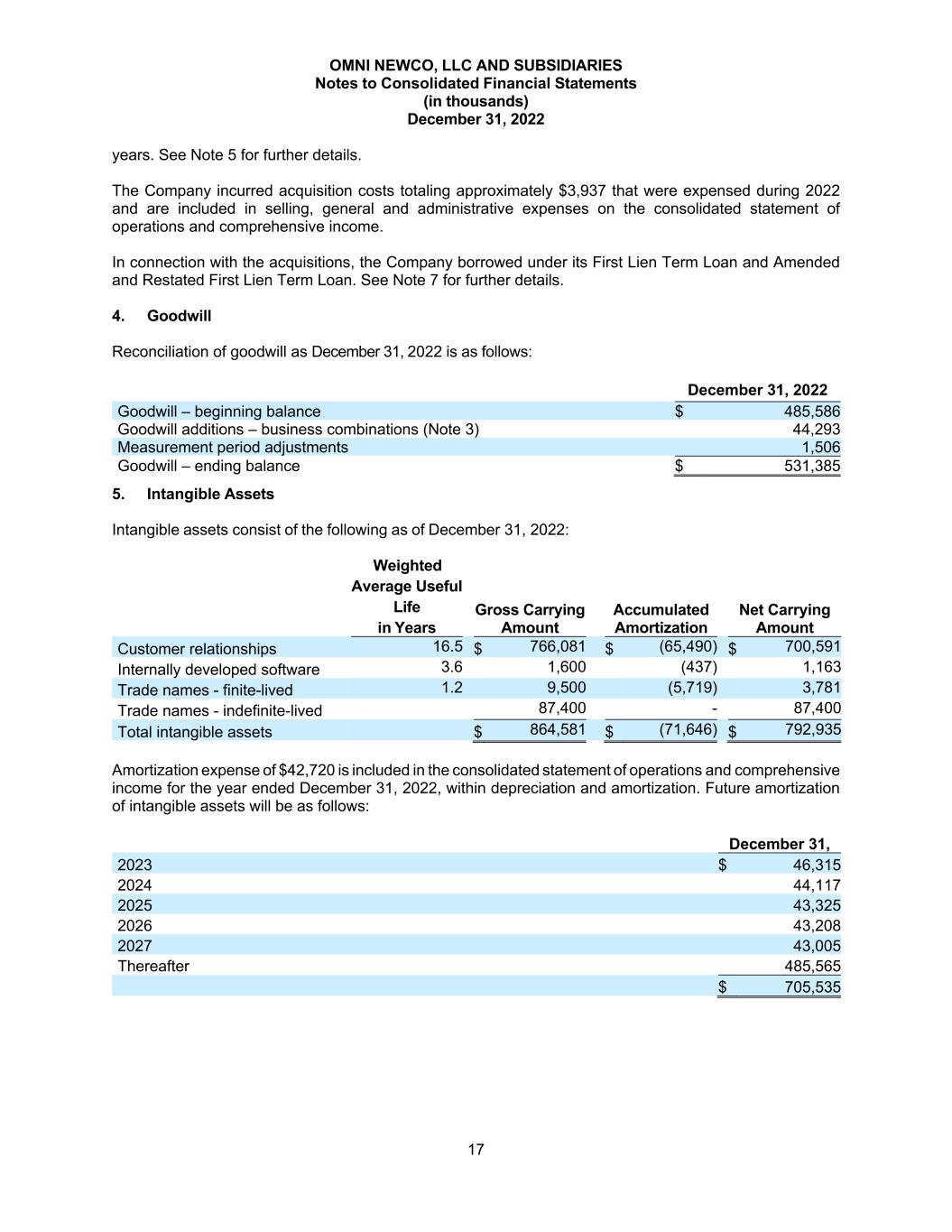 OMNI NEWCO, LLC AND SUBSIDIARIES Notes to Consolidated Financial Statements (in thousands) December 31, 2022 17 years. See Note 5 for further details. The Company incurred acquisition costs totaling approximately $3,937 that were expensed during 2022 and are included in selling, general and administrative expenses on the consolidated statement of operations and comprehensive income. In connection with the acquisitions, the Company borrowed under its First Lien Term Loan and Amended and Restated First Lien Term Loan. See Note 7 for further details. 4. Goodwill Reconciliation of goodwill as December 31, 2022 is as follows: December 31, 2022 Goodwill – beginning balance $ 485,586 Goodwill additions – business combinations (Note 3) 44,293 Measurement period adjustments 1,506 Goodwill – ending balance $ 531,385 5. Intangible Assets Intangible assets consist of the following as of December 31, 2022: Weighted Average Useful Life in Years Gross Carrying Amount Accumulated Amortization Net Carrying Amount Customer relationships 16.5 $ 766,081 $ (65,490) $ 700,591 Internally developed software 3.6 1,600 (437) 1,163 Trade names - finite-lived 1.2 9,500 (5,719) 3,781 Trade names - indefinite-lived 87,400 - 87,400 Total intangible assets $ 864,581 $ (71,646) $ 792,935 Amortization expense of $42,720 is included in the consolidated statement of operations and comprehensive income for the year ended December 31, 2022, within depreciation and amortization. Future amortization of intangible assets will be as follows: December 31, 2023 $ 46,315 2024 44,117 2025 43,325 2026 43,208 2027 43,005 Thereafter 485,565 $ 705,535