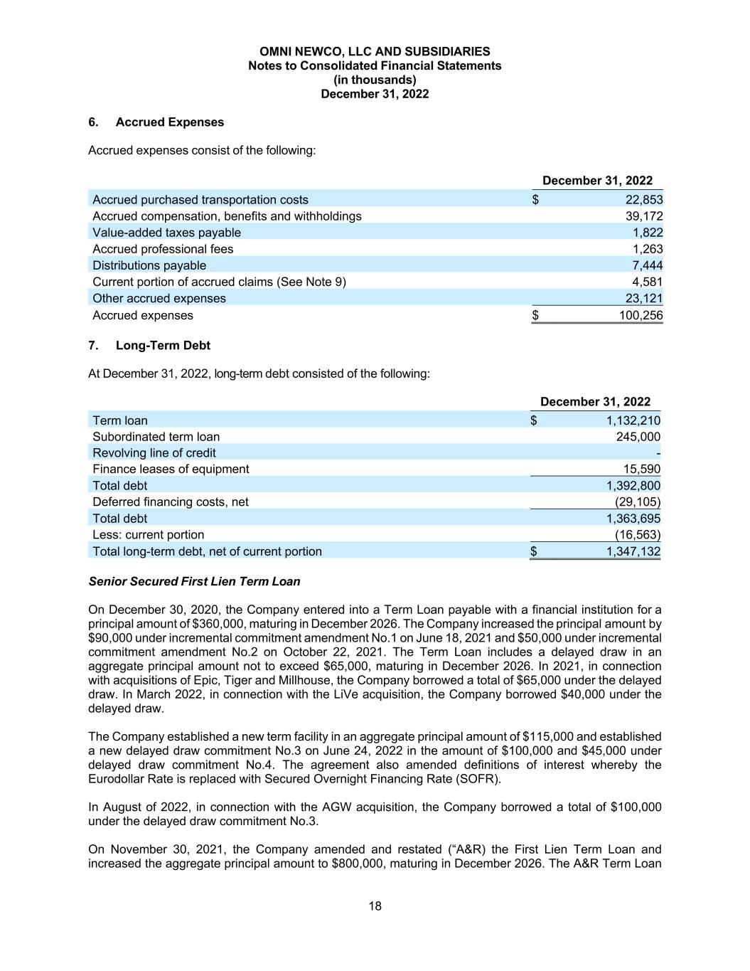 OMNI NEWCO, LLC AND SUBSIDIARIES Notes to Consolidated Financial Statements (in thousands) December 31, 2022 18 6. Accrued Expenses Accrued expenses consist of the following: December 31, 2022 Accrued purchased transportation costs $ 22,853 Accrued compensation, benefits and withholdings 39,172 Value-added taxes payable 1,822 Accrued professional fees 1,263 Distributions payable 7,444 Current portion of accrued claims (See Note 9) 4,581 Other accrued expenses 23,121 Accrued expenses $ 100,256 7. Long-Term Debt At December 31, 2022, long-term debt consisted of the following: December 31, 2022 Term loan $ 1,132,210 Subordinated term loan 245,000 Revolving line of credit - Finance leases of equipment 15,590 Total debt 1,392,800 Deferred financing costs, net (29,105) Total debt 1,363,695 Less: current portion (16,563) Total long-term debt, net of current portion $ 1,347,132 Senior Secured First Lien Term Loan On December 30, 2020, the Company entered into a Term Loan payable with a financial institution for a principal amount of $360,000, maturing in December 2026. The Company increased the principal amount by $90,000 under incremental commitment amendment No.1 on June 18, 2021 and $50,000 under incremental commitment amendment No.2 on October 22, 2021. The Term Loan includes a delayed draw in an aggregate principal amount not to exceed $65,000, maturing in December 2026. In 2021, in connection with acquisitions of Epic, Tiger and Millhouse, the Company borrowed a total of $65,000 under the delayed draw. In March 2022, in connection with the LiVe acquisition, the Company borrowed $40,000 under the delayed draw. The Company established a new term facility in an aggregate principal amount of $115,000 and established a new delayed draw commitment No.3 on June 24, 2022 in the amount of $100,000 and $45,000 under delayed draw commitment No.4. The agreement also amended definitions of interest whereby the Eurodollar Rate is replaced with Secured Overnight Financing Rate (SOFR). In August of 2022, in connection with the AGW acquisition, the Company borrowed a total of $100,000 under the delayed draw commitment No.3. On November 30, 2021, the Company amended and restated (“A&R) the First Lien Term Loan and increased the aggregate principal amount to $800,000, maturing in December 2026. The A&R Term Loan