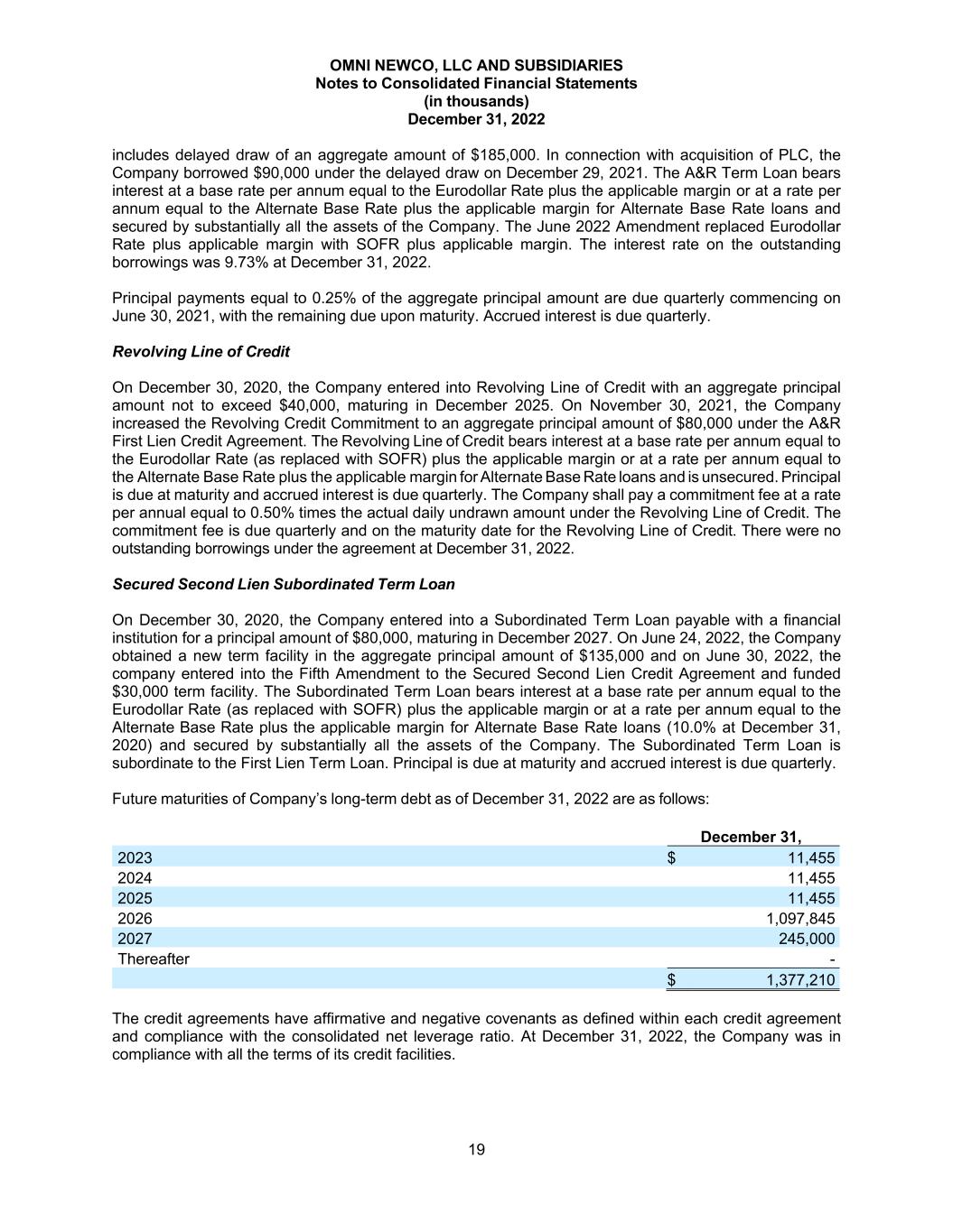 OMNI NEWCO, LLC AND SUBSIDIARIES Notes to Consolidated Financial Statements (in thousands) December 31, 2022 19 includes delayed draw of an aggregate amount of $185,000. In connection with acquisition of PLC, the Company borrowed $90,000 under the delayed draw on December 29, 2021. The A&R Term Loan bears interest at a base rate per annum equal to the Eurodollar Rate plus the applicable margin or at a rate per annum equal to the Alternate Base Rate plus the applicable margin for Alternate Base Rate loans and secured by substantially all the assets of the Company. The June 2022 Amendment replaced Eurodollar Rate plus applicable margin with SOFR plus applicable margin. The interest rate on the outstanding borrowings was 9.73% at December 31, 2022. Principal payments equal to 0.25% of the aggregate principal amount are due quarterly commencing on June 30, 2021, with the remaining due upon maturity. Accrued interest is due quarterly. Revolving Line of Credit On December 30, 2020, the Company entered into Revolving Line of Credit with an aggregate principal amount not to exceed $40,000, maturing in December 2025. On November 30, 2021, the Company increased the Revolving Credit Commitment to an aggregate principal amount of $80,000 under the A&R First Lien Credit Agreement. The Revolving Line of Credit bears interest at a base rate per annum equal to the Eurodollar Rate (as replaced with SOFR) plus the applicable margin or at a rate per annum equal to the Alternate Base Rate plus the applicable margin for Alternate Base Rate loans and is unsecured. Principal is due at maturity and accrued interest is due quarterly. The Company shall pay a commitment fee at a rate per annual equal to 0.50% times the actual daily undrawn amount under the Revolving Line of Credit. The commitment fee is due quarterly and on the maturity date for the Revolving Line of Credit. There were no outstanding borrowings under the agreement at December 31, 2022. Secured Second Lien Subordinated Term Loan On December 30, 2020, the Company entered into a Subordinated Term Loan payable with a financial institution for a principal amount of $80,000, maturing in December 2027. On June 24, 2022, the Company obtained a new term facility in the aggregate principal amount of $135,000 and on June 30, 2022, the company entered into the Fifth Amendment to the Secured Second Lien Credit Agreement and funded $30,000 term facility. The Subordinated Term Loan bears interest at a base rate per annum equal to the Eurodollar Rate (as replaced with SOFR) plus the applicable margin or at a rate per annum equal to the Alternate Base Rate plus the applicable margin for Alternate Base Rate loans (10.0% at December 31, 2020) and secured by substantially all the assets of the Company. The Subordinated Term Loan is subordinate to the First Lien Term Loan. Principal is due at maturity and accrued interest is due quarterly. Future maturities of Company’s long-term debt as of December 31, 2022 are as follows: December 31, 2023 $ 11,455 2024 11,455 2025 11,455 2026 1,097,845 2027 245,000 Thereafter - $ 1,377,210 The credit agreements have affirmative and negative covenants as defined within each credit agreement and compliance with the consolidated net leverage ratio. At December 31, 2022, the Company was in compliance with all the terms of its credit facilities.