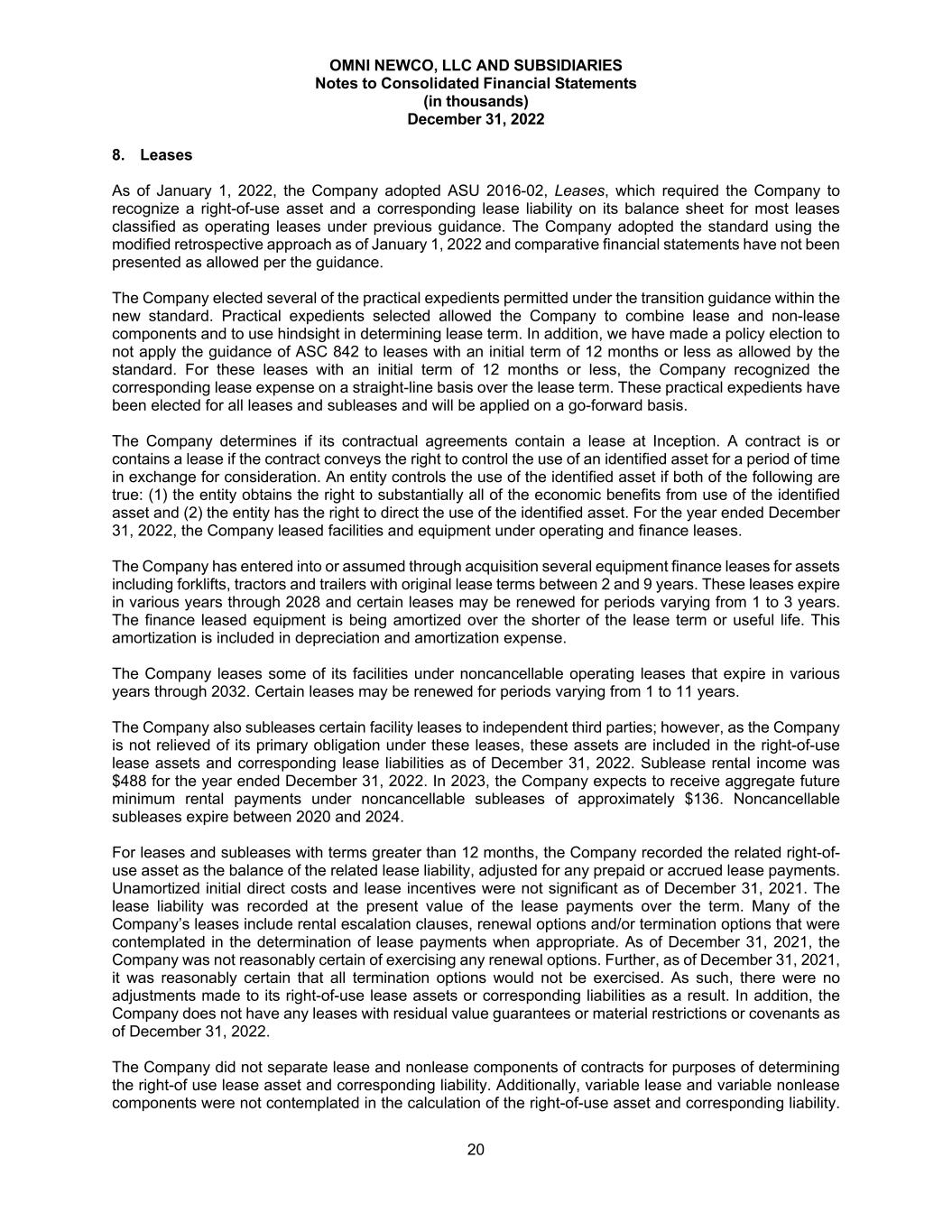 OMNI NEWCO, LLC AND SUBSIDIARIES Notes to Consolidated Financial Statements (in thousands) December 31, 2022 20 8. Leases As of January 1, 2022, the Company adopted ASU 2016-02, Leases, which required the Company to recognize a right-of-use asset and a corresponding lease liability on its balance sheet for most leases classified as operating leases under previous guidance. The Company adopted the standard using the modified retrospective approach as of January 1, 2022 and comparative financial statements have not been presented as allowed per the guidance. The Company elected several of the practical expedients permitted under the transition guidance within the new standard. Practical expedients selected allowed the Company to combine lease and non-lease components and to use hindsight in determining lease term. In addition, we have made a policy election to not apply the guidance of ASC 842 to leases with an initial term of 12 months or less as allowed by the standard. For these leases with an initial term of 12 months or less, the Company recognized the corresponding lease expense on a straight-line basis over the lease term. These practical expedients have been elected for all leases and subleases and will be applied on a go-forward basis. The Company determines if its contractual agreements contain a lease at Inception. A contract is or contains a lease if the contract conveys the right to control the use of an identified asset for a period of time in exchange for consideration. An entity controls the use of the identified asset if both of the following are true: (1) the entity obtains the right to substantially all of the economic benefits from use of the identified asset and (2) the entity has the right to direct the use of the identified asset. For the year ended December 31, 2022, the Company leased facilities and equipment under operating and finance leases. The Company has entered into or assumed through acquisition several equipment finance leases for assets including forklifts, tractors and trailers with original lease terms between 2 and 9 years. These leases expire in various years through 2028 and certain leases may be renewed for periods varying from 1 to 3 years. The finance leased equipment is being amortized over the shorter of the lease term or useful life. This amortization is included in depreciation and amortization expense. The Company leases some of its facilities under noncancellable operating leases that expire in various years through 2032. Certain leases may be renewed for periods varying from 1 to 11 years. The Company also subleases certain facility leases to independent third parties; however, as the Company is not relieved of its primary obligation under these leases, these assets are included in the right-of-use lease assets and corresponding lease liabilities as of December 31, 2022. Sublease rental income was $488 for the year ended December 31, 2022. In 2023, the Company expects to receive aggregate future minimum rental payments under noncancellable subleases of approximately $136. Noncancellable subleases expire between 2020 and 2024. For leases and subleases with terms greater than 12 months, the Company recorded the related right-of- use asset as the balance of the related lease liability, adjusted for any prepaid or accrued lease payments. Unamortized initial direct costs and lease incentives were not significant as of December 31, 2021. The lease liability was recorded at the present value of the lease payments over the term. Many of the Company’s leases include rental escalation clauses, renewal options and/or termination options that were contemplated in the determination of lease payments when appropriate. As of December 31, 2021, the Company was not reasonably certain of exercising any renewal options. Further, as of December 31, 2021, it was reasonably certain that all termination options would not be exercised. As such, there were no adjustments made to its right-of-use lease assets or corresponding liabilities as a result. In addition, the Company does not have any leases with residual value guarantees or material restrictions or covenants as of December 31, 2022. The Company did not separate lease and nonlease components of contracts for purposes of determining the right-of use lease asset and corresponding liability. Additionally, variable lease and variable nonlease components were not contemplated in the calculation of the right-of-use asset and corresponding liability.