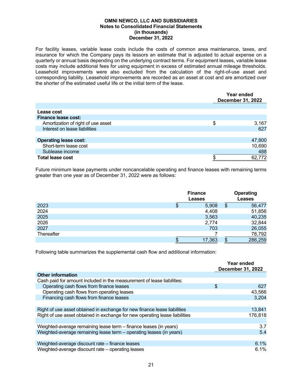 OMNI NEWCO, LLC AND SUBSIDIARIES Notes to Consolidated Financial Statements (in thousands) December 31, 2022 21 For facility leases, variable lease costs include the costs of common area maintenance, taxes, and insurance for which the Company pays its lessors an estimate that is adjusted to actual expense on a quarterly or annual basis depending on the underlying contract terms. For equipment leases, variable lease costs may include additional fees for using equipment in excess of estimated annual mileage thresholds. Leasehold improvements were also excluded from the calculation of the right-of-use asset and corresponding liability. Leasehold improvements are recorded as an asset at cost and are amortized over the shorter of the estimated useful life or the initial term of the lease. Year ended December 31, 2022 Lease cost Finance lease cost: Amortization of right of use asset $ 3,167 Interest on lease liabilities 627 Operating lease cost: 47,800 Short-term lease cost 10,690 Sublease income 488 Total lease cost $ 62,772 Future minimum lease payments under noncancelable operating and finance leases with remaining terms greater than one year as of December 31, 2022 were as follows: Finance Leases Operating Leases 2023 $ 5,908 $ 56,477 2024 4,408 51,856 2025 3,563 40,235 2026 2,774 32,844 2027 703 26,055 Thereafter 7 78,792 $ 17,363 $ 286,259 Following table summarizes the supplemental cash flow and additional information: Year ended December 31, 2022 Other information Cash paid for amount included in the measurement of lease liabilities: Operating cash flows from finance leases $ 627 Operating cash flows from operating leases 43,566 Financing cash flows from finance leases 3,204 Right of use asset obtained in exchange for new finance lease liabilities 13,841 Right of use asset obtained in exchange for new operating lease liabilities 176,818 Weighted-average remaining lease term – finance leases (in years) 3.7 Weighted-average remaining lease term – operating leases (in years) 5.4 Weighted-average discount rate – finance leases 6.1% Weighted-average discount rate – operating leases 6.1%