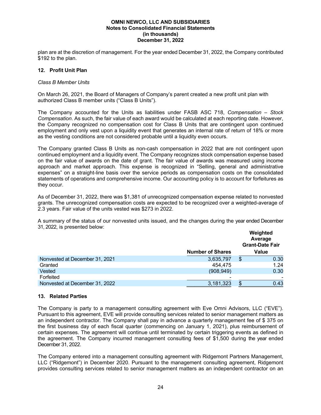 OMNI NEWCO, LLC AND SUBSIDIARIES Notes to Consolidated Financial Statements (in thousands) December 31, 2022 24 plan are at the discretion of management. For the year ended December 31, 2022, the Company contributed $192 to the plan. 12. Profit Unit Plan Class B Member Units On March 26, 2021, the Board of Managers of Company’s parent created a new profit unit plan with authorized Class B member units (“Class B Units”). The Company accounted for the Units as liabilities under FASB ASC 718, Compensation – Stock Compensation. As such, the fair value of each award would be calculated at each reporting date. However, the Company recognized no compensation cost for Class B Units that are contingent upon continued employment and only vest upon a liquidity event that generates an internal rate of return of 18% or more as the vesting conditions are not considered probable until a liquidity even occurs. The Company granted Class B Units as non-cash compensation in 2022 that are not contingent upon continued employment and a liquidity event. The Company recognizes stock compensation expense based on the fair value of awards on the date of grant. The fair value of awards was measured using income approach and market approach. This expense is recognized in “Selling, general and administrative expenses” on a straight-line basis over the service periods as compensation costs on the consolidated statements of operations and comprehensive income. Our accounting policy is to account for forfeitures as they occur. As of December 31, 2022, there was $1,381 of unrecognized compensation expense related to nonvested grants. The unrecognized compensation costs are expected to be recognized over a weighted-average of 2.3 years. Fair value of the units vested was $273 in 2022. A summary of the status of our nonvested units issued, and the changes during the year ended December 31, 2022, is presented below: Number of Shares Weighted Average Grant-Date Fair Value Nonvested at December 31, 2021 3,635,797 $ 0.30 Granted 454,475 1.24 Vested (908,949) 0.30 Forfeited - - Nonvested at December 31, 2022 3,181,323 $ 0.43 13. Related Parties The Company is party to a management consulting agreement with Eve Omni Advisors, LLC (“EVE”). Pursuant to this agreement, EVE will provide consulting services related to senior management matters as an independent contractor. The Company shall pay in advance a quarterly management fee of $ 375 on the first business day of each fiscal quarter (commencing on January 1, 2021), plus reimbursement of certain expenses. The agreement will continue until terminated by certain triggering events as defined in the agreement. The Company incurred management consulting fees of $1,500 during the year ended December 31, 2022. The Company entered into a management consulting agreement with Ridgemont Partners Management, LLC (“Ridgemont”) in December 2020. Pursuant to the management consulting agreement, Ridgemont provides consulting services related to senior management matters as an independent contractor on an