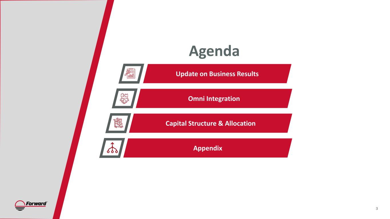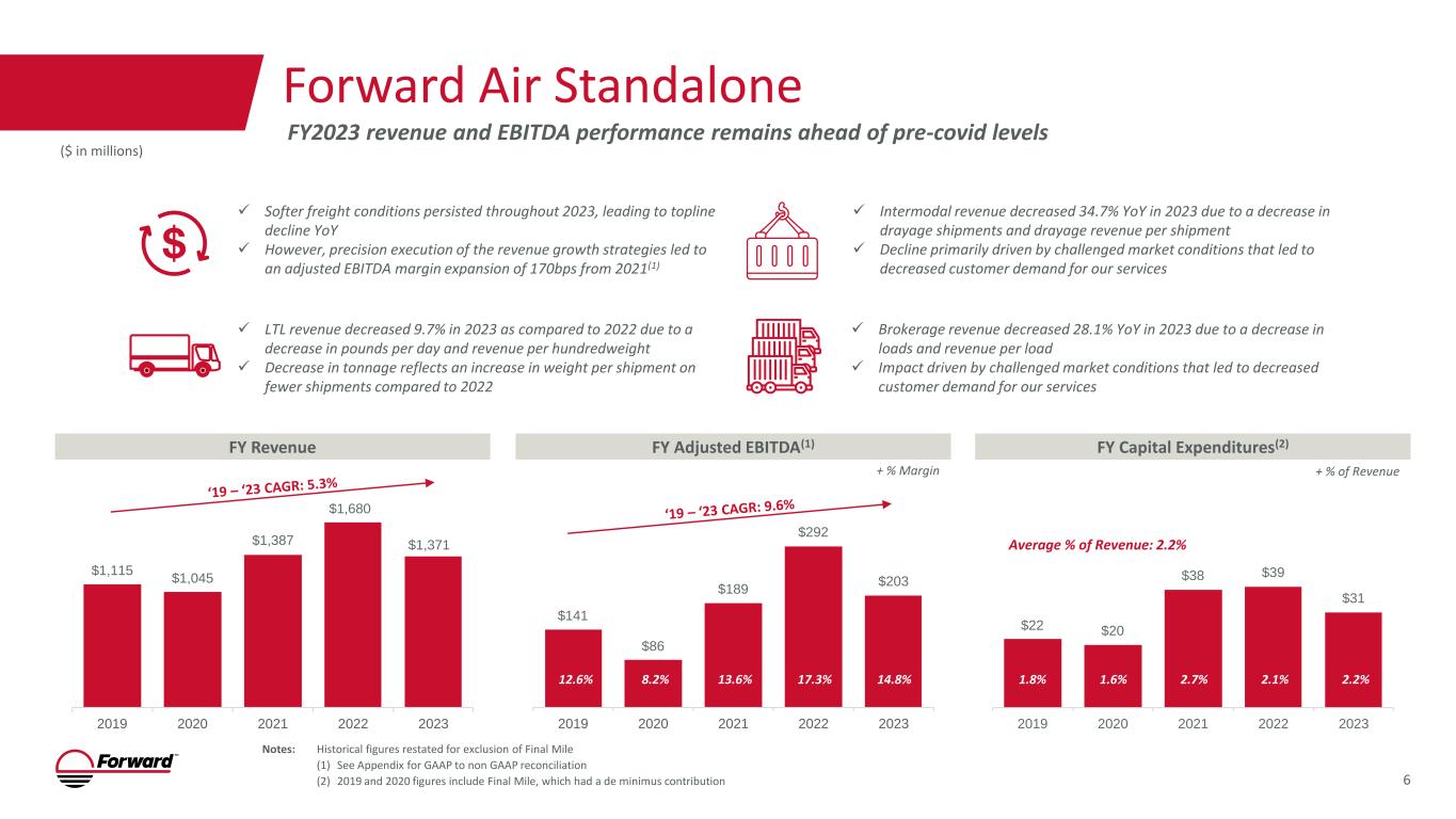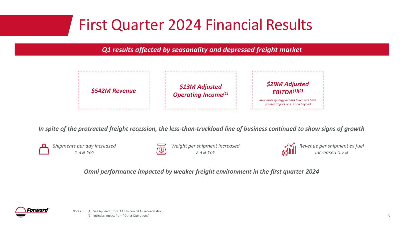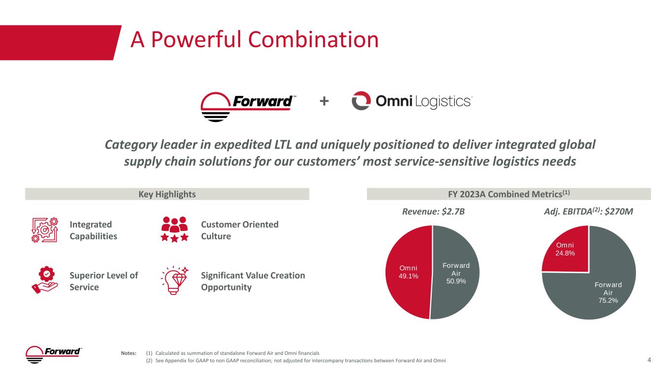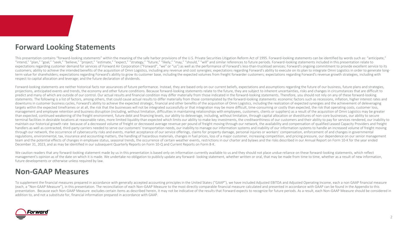Forward Looking Statements This presentation contains “forward-looking statements” within the meaning of the safe harbor provisions of the U.S. Private Securities Litigation Reform Act of 1995. Forward-looking statements can be identified by words such as: “anticipate,” “intend,” “plan,” “goal,” “seek,” “believe,” “project,” “estimate,” “expect,” “strategy,” “future,” “likely,” “may,” “should,” “will” and similar references to future periods. Forward-looking statements included in this presentation relate to expectations regarding customer demand for services of Forward Air Corporation (“Forward”, “we” or “us”) as well as the performance of Forward’s less-than-truckload services; Forward's ongoing commitment to provide excellent service to its customers; ability to achieve the intended benefits of the acquisition of Omni Logistics, including any revenue and cost synergies; expectations regarding Forward's ability to execute on its plan to integrate Omni Logistics in order to generate long- term value for shareholders; expectations regarding Forward's ability to grow its customer base, including the expected volumes from freight forwarder customers; expectations regarding Forward's revenue growth strategies, including with respect to capital allocation and leverage; and the future declaration of dividends. Forward-looking statements are neither historical facts nor assurances of future performance. Instead, they are based only on our current beliefs, expectations and assumptions regarding the future of our business, future plans and strategies, projections, anticipated events and trends, the economy and other future conditions. Because forward-looking statements relate to the future, they are subject to inherent uncertainties, risks and changes in circumstances that are difficult to predict and many of which are outside of our control. Our actual results and financial condition may differ materially from those indicated in the forward-looking statements. Therefore, you should not rely on any of these forward-looking statements. The following is a list of factors, among others, that could cause actual results to differ materially from those contemplated by the forward-looking statements: economic factors such as recessions, inflation, higher interest rates and downturns in customer business cycles, Forward's ability to achieve the expected strategic, financial and other benefits of the acquisition of Omni Logistics, including the realization of expected synergies and the achievement of deleveraging targets within the expected timeframes or at all, the risk that the businesses will not be integrated successfully or that integration may be more difficult, time-consuming or costly than expected, the risk that operating costs, customer loss, management and employee retention and business disruption (including, without limitation, difficulties in maintaining relationships with employees, customers, clients or suppliers) as a result of the acquisition of Omni Logistics may be greater than expected, continued weakening of the freight environment, future debt and financing levels, our ability to deleverage, including, without limitation, through capital allocation or divestitures of non-core businesses, our ability to secure terminal facilities in desirable locations at reasonable rates, more limited liquidity than expected which limits our ability to make key investments, the creditworthiness of our customers and their ability to pay for services rendered, our inability to maintain our historical growth rate because of a decreased volume of freight or decreased average revenue per pound of freight moving through our network, the availability and compensation of qualified Leased Capacity Providers and freight handlers as well as contracted, third-party carriers needed to serve our customers’ transportation needs, our inability to manage our information systems and inability of our information systems to handle an increased volume of freight moving through our network, the occurrence of cybersecurity risks and events, market acceptance of our service offerings, claims for property damage, personal injuries or workers’ compensation, enforcement of and changes in governmental regulations, environmental, tax, insurance and accounting matters, the handling of hazardous materials, changes in fuel prices, loss of a major customer, increasing competition, and pricing pressure, our dependence on our senior management team and the potential effects of changes in employee status, seasonal trends, the occurrence of certain weather events, restrictions in our charter and bylaws and the risks described in our Annual Report on Form 10-K for the year ended December 31, 2023, and as may be identified in our subsequent Quarterly Reports on Form 10-Q and Current Reports on Form 8-K. We caution readers that any forward-looking statement made by us in this presentation is based only on information currently available to us and they should not place undue reliance on these forward-looking statements, which reflect management's opinion as of the date on which it is made. We undertake no obligation to publicly update any forward- looking statement, whether written or oral, that may be made from time to time, whether as a result of new information, future developments or otherwise unless required by law. Non-GAAP Measures To supplement the financial measures prepared in accordance with generally accepted accounting principles in the United States (“GAAP”), we have included Adjusted EBITDA and Adjusted Operating Income, each a non GAAP financial measure (each, a “Non-GAAP Measure”), in this presentation. The reconciliation of each Non-GAAP Measure to the most directly comparable financial measure calculated and presented in accordance with GAAP can be found in the Appendix to this presentation. Because each Non-GAAP Measure excludes c