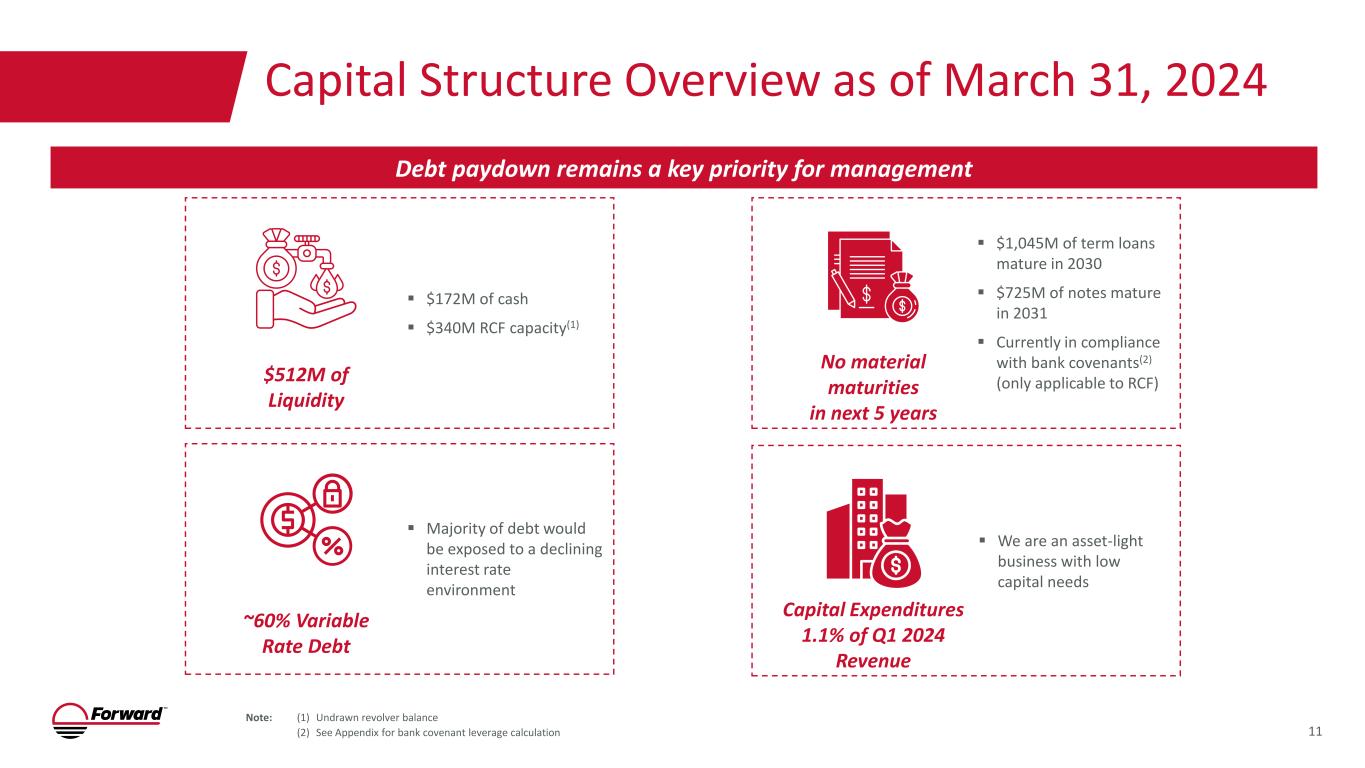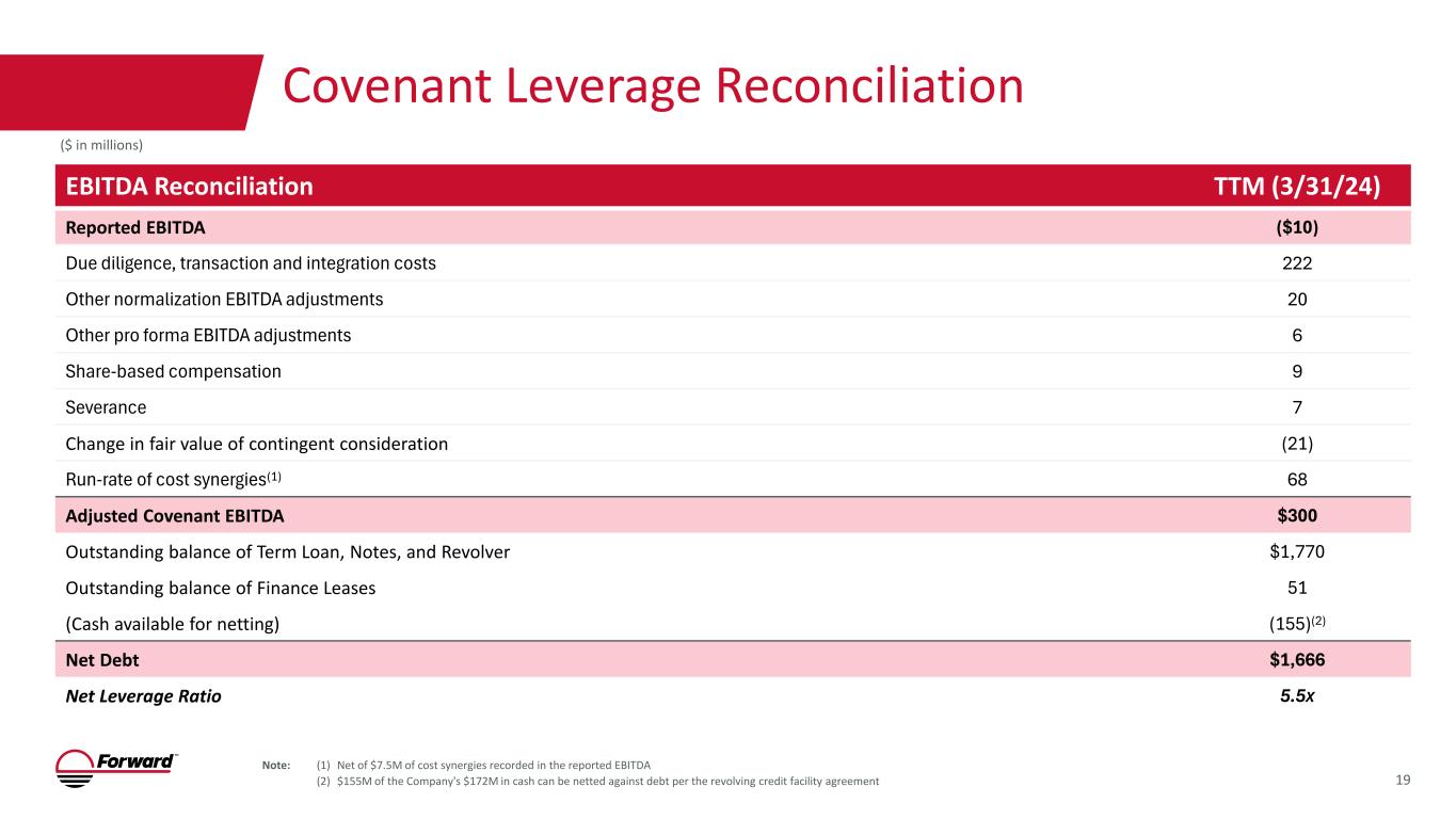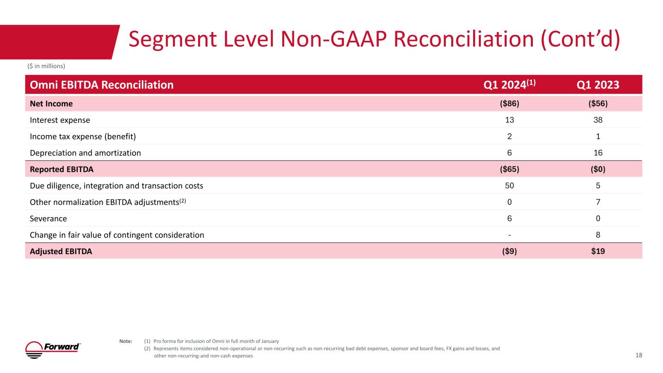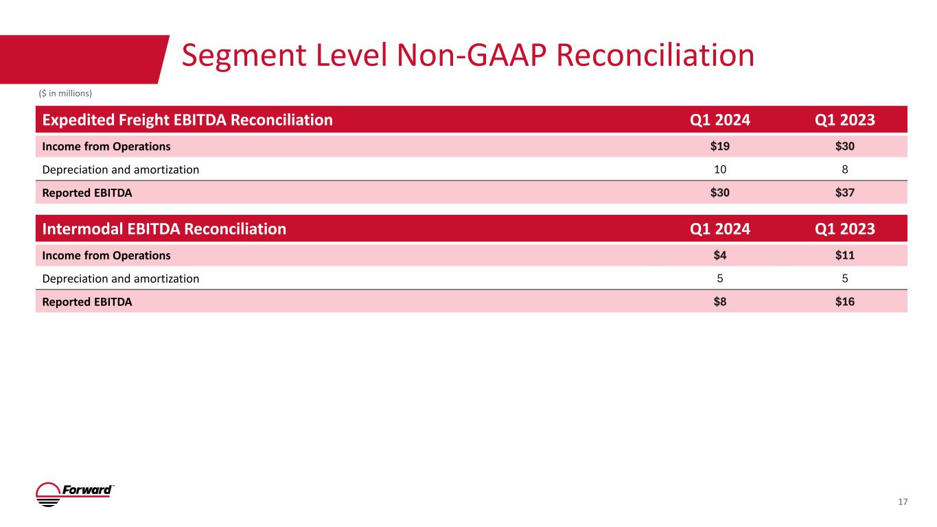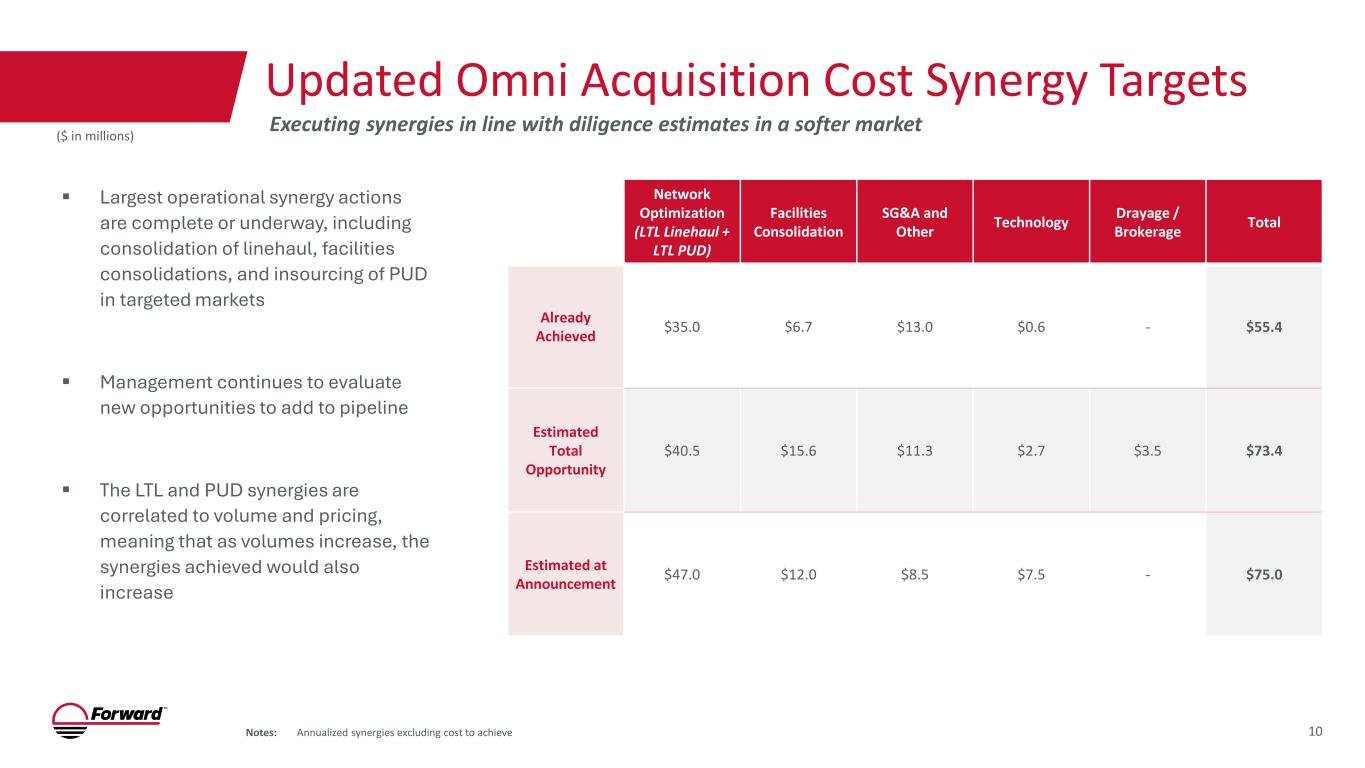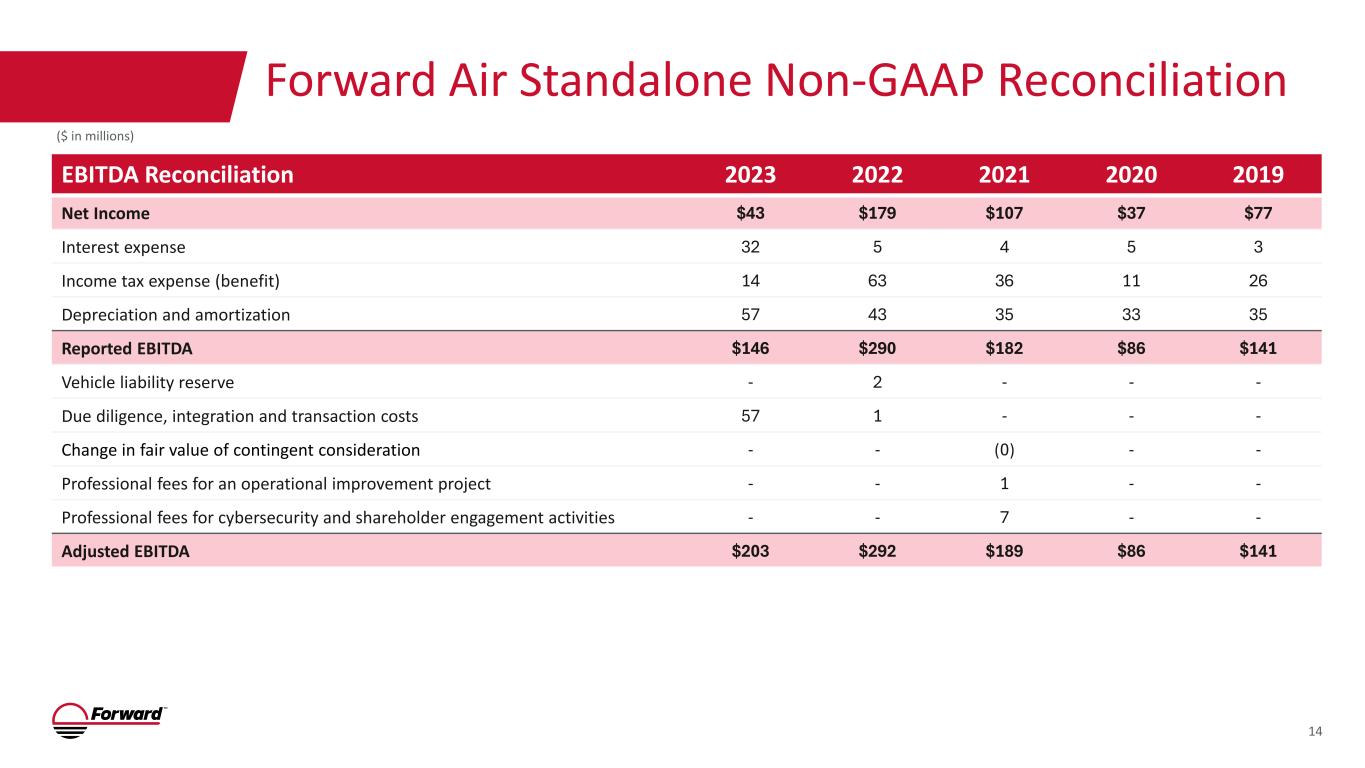 Forward Looking Statements This presentation contains “forward-looking statements” within the meaning of the safe harbor provisions of the U.S. Private Securities Litigation Reform Act of 1995. Forward-looking statements can be identified by words such as: “anticipate,” “intend,” “plan,” “goal,” “seek,” “believe,” “project,” “estimate,” “expect,” “strategy,” “future,” “likely,” “may,” “should,” “will” and similar references to future periods. Forward-looking statements included in this presentation relate to expectations regarding customer demand for services of Forward Air Corporation (“Forward”, “we” or “us”) as well as the performance of Forward’s less-than-truckload services; Forward's ongoing commitment to provide excellent service to its customers; ability to achieve the intended benefits of the acquisition of Omni Logistics, including any revenue and cost synergies; expectations regarding Forward's ability to execute on its plan to integrate Omni Logistics in order to generate long- term value for shareholders; expectations regarding Forward's ability to grow its customer base, including the expected volumes from freight forwarder customers; expectations regarding Forward's revenue growth strategies, including with respect to capital allocation and leverage; and the future declaration of dividends. Forward-looking statements are neither historical facts nor assurances of future performance. Instead, they are based only on our current beliefs, expectations and assumptions regarding the future of our business, future plans and strategies, projections, anticipated events and trends, the economy and other future conditions. Because forward-looking statements relate to the future, they are subject to inherent uncertainties, risks and changes in circumstances that are difficult to predict and many of which are outside of our control. Our actual results and financial condition may differ materially from those indicated in the forward-looking statements. Therefore, you should not rely on any of these forward-looking statements. The following is a list of factors, among others, that could cause actual results to differ materially from those contemplated by the forward-looking statements: economic factors such as recessions, inflation, higher interest rates and downturns in customer business cycles, Forward's ability to achieve the expected strategic, financial and other benefits of the acquisition of Omni Logistics, including the realization of expected synergies and the achievement of deleveraging targets within the expected timeframes or at all, the risk that the businesses will not be integrated successfully or that integration may be more difficult, time-consuming or costly than expected, the risk that operating costs, customer loss, management and employee retention and business disruption (including, without limitation, difficulties in maintaining relationships with employees, customers, clients or suppliers) as a result of the acquisition of Omni Logistics may be greater than expected, continued weakening of the freight environment, future debt and financing levels, our ability to deleverage, including, without limitation, through capital allocation or divestitures of non-core businesses, our ability to secure terminal facilities in desirable locations at reasonable rates, more limited liquidity than expected which limits our ability to make key investments, the creditworthiness of our customers and their ability to pay for services rendered, our inability to maintain our historical growth rate because of a decreased volume of freight or decreased average revenue per pound of freight moving through our network, the availability and compensation of qualified Leased Capacity Providers and freight handlers as well as contracted, third-party carriers needed to serve our customers’ transportation needs, our inability to manage our information systems and inability of our information systems to handle an increased volume of freight moving through our network, the occurrence of cybersecurity risks and events, market acceptance of our service offerings, claims for property damage, personal injuries or workers’ compensation, enforcement of and changes in governmental regulations, environmental, tax, insurance and accounting matters, the handling of hazardous materials, changes in fuel prices, loss of a major customer, increasing competition, and pricing pressure, our dependence on our senior management team and the potential effects of changes in employee status, seasonal trends, the occurrence of certain weather events, restrictions in our charter and bylaws and the risks described in our Annual Report on Form 10-K for the year ended December 31, 2023, and as may be identified in our subsequent Quarterly Reports on Form 10-Q and Current Reports on Form 8-K. We caution readers that any forward-looking statement made by us in this presentation is based only on information currently available to us and they should not place undue reliance on these forward-looking statements, which reflect management's opinion as of the date on which it is made. We undertake no obligation to publicly update any forward- looking statement, whether written or oral, that may be made from time to time, whether as a result of new information, future developments or otherwise unless required by law. Non-GAAP Measures To supplement the financial measures prepared in accordance with generally accepted accounting principles in the United States (“GAAP”), we have included Adjusted EBITDA and Adjusted Operating Income, each a non GAAP financial measure (each, a “Non-GAAP Measure”), in this presentation. The reconciliation of each Non-GAAP Measure to the most directly comparable financial measure calculated and presented in accordance with GAAP can be found in the Appendix to this presentation. Because each Non-GAAP Measure excludes c