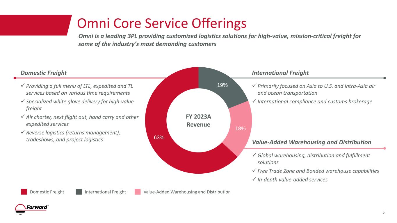 A Powerful Combination 4 Category leader in expedited LTL and uniquely positioned to deliver integrated global supply chain solutions for our customers’ most service-sensitive logistics needs + Integrated Capabilities Customer Oriented Culture Superior Level of Service Significant Value Creation Opportunity Adj. EBITDA(2): $270MRevenue: $2.7B Forward Air 50.9% Omni 49.1% Forward Air 75.2% Omni 24.8% Notes: (1) Calculated as summation of standalone Forward Air and Omni financials (2) See Appendix for GAAP to non GAAP reconciliation; not adjusted for intercompany transactions between Forward Air and Omni FY 2023A Combined Metrics(1)Key Highlights