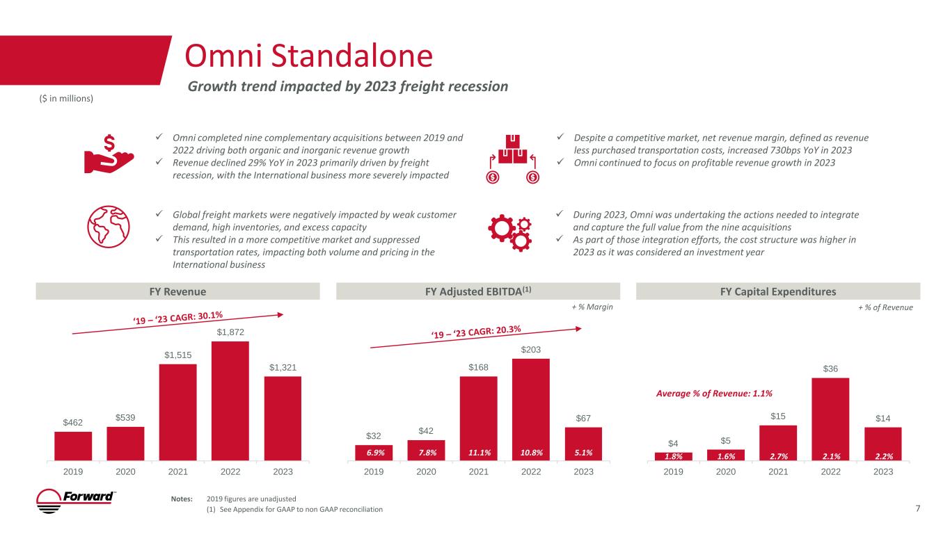 ✓ Softer freight conditions persisted throughout 2023, leading to topline decline YoY ✓ However, precision execution of the revenue growth strategies led to an adjusted EBITDA margin expansion of 170bps from 2021(1) ✓ Brokerage revenue decreased 28.1% YoY in 2023 due to a decrease in loads and revenue per load ✓ Impact driven by challenged market conditions that led to decreased customer demand for our services ✓ Intermodal revenue decreased 34.7% YoY in 2023 due to a decrease in drayage shipments and drayage revenue per shipment ✓ Decline primarily driven by challenged market conditions that led to decreased customer demand for our services ✓ LTL revenue decreased 9.7% in 2023 as compared to 2022 due to a decrease in pounds per day and revenue per hundredweight ✓ Decrease in tonnage reflects an increase in weight per shipment on fewer shipments compared to 2022 Forward Air Standalone 6 ($ in millions) FY Revenue FY Adjusted EBITDA(1) FY Capital Expenditures(2) Margin: 17.4% Notes: Historical figures restated for exclusion of Final Mile (1) See Appendix for GAAP to non GAAP reconciliation (2) 2019 and 2020 figures include Final Mile, which had a de minimus contribution FY2023 revenue and EBITDA performance remains ahead of pre-covid levels + % Margin Average % of Revenue: 2.2% + % of Revenue $1,115 $1,045 $1,387 $1,680 $1,371 2019 2020 2021 2022 2023 $141 $86 $189 $292 $203 2019 2020 2021 2022 2023 12.6% 8.2% 17.3% 14.8%13.6% $22 $20 $38 $39 $31 2019 2020 2021 2022 2023 2.2%2.1%2.7%1.6%1.8%