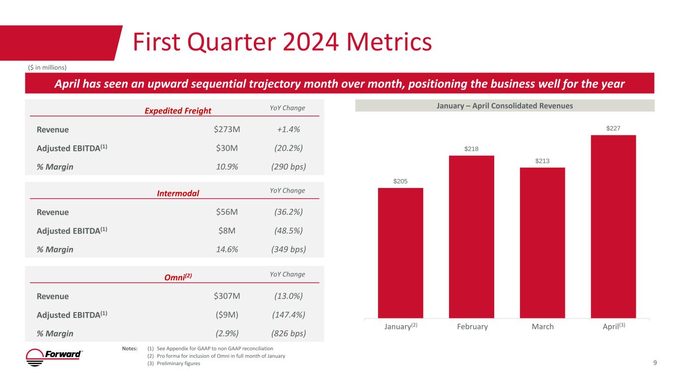 First Quarter 2024 Financial Results 8 $542M Revenue $13M Adjusted Operating Income(1) $29M Adjusted EBITDA(1)(2) Notes: (1) See Appendix for GAAP to non GAAP reconciliation (2) Includes impact from “Other Operations” In spite of the protracted freight recession, the less-than-truckload line of business continued to show signs of growth Q1 results affected by seasonality and depressed freight market Omni performance impacted by weaker freight environment in the first quarter 2024 Shipments per day increased 1.4% YoY Weight per shipment increased 7.4% YoY Revenue per shipment ex fuel increased 0.7% In-quarter synergy actions taken will have greater impact on Q2 and beyond