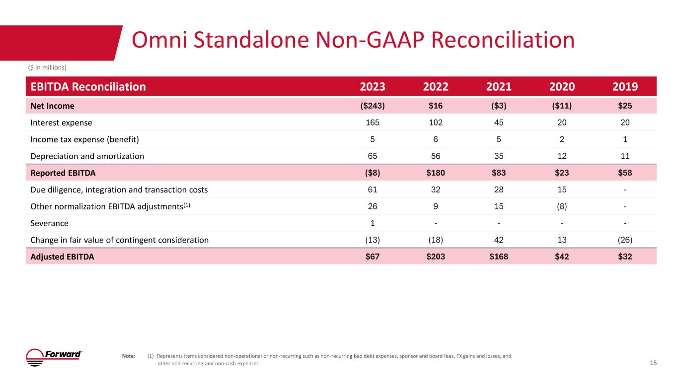 Forward Air Standalone Non-GAAP Reconciliation 14 EBITDA Reconciliation 2023 2022 2021 2020 2019 Net Income $43 $179 $107 $37 $77 Interest expense 32 5 4 5 3 Income tax expense (benefit) 14 63 36 11 26 Depreciation and amortization 57 43 35 33 35 Reported EBITDA $146 $290 $182 $86 $141 Vehicle liability reserve - 2 - - - Due diligence, integration and transaction costs 57 1 - - - Change in fair value of contingent consideration - - (0) - - Professional fees for an operational improvement project - - 1 - - Professional fees for cybersecurity and shareholder engagement activities - - 7 - - Adjusted EBITDA $203 $292 $189 $86 $141 ($ in millions)