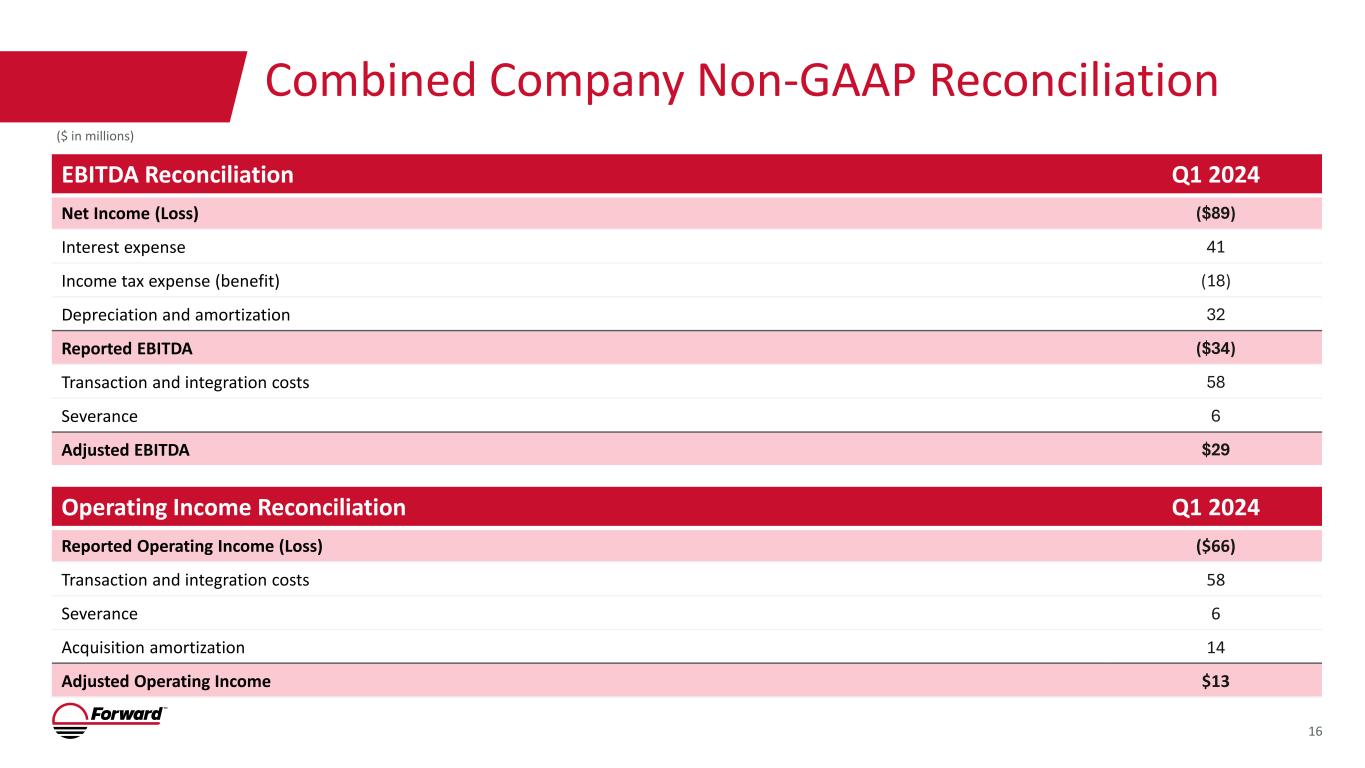 Combined Company Non-GAAP Reconciliation 16 EBITDA Reconciliation Q1 2024 Net Income (Loss) ($89) Interest expense 41 Income tax expense (benefit) (18) Depreciation and amortization 32 Reported EBITDA ($34) Transaction and integration costs 58 Severance 6 Adjusted EBITDA $29 Operating Income Reconciliation Q1 2024 Reported Operating Income (Loss) ($66) Transaction and integration costs 58 Severance 6 Acquisition amortization 14 Adjusted Operating Income $13 ($ in millions)