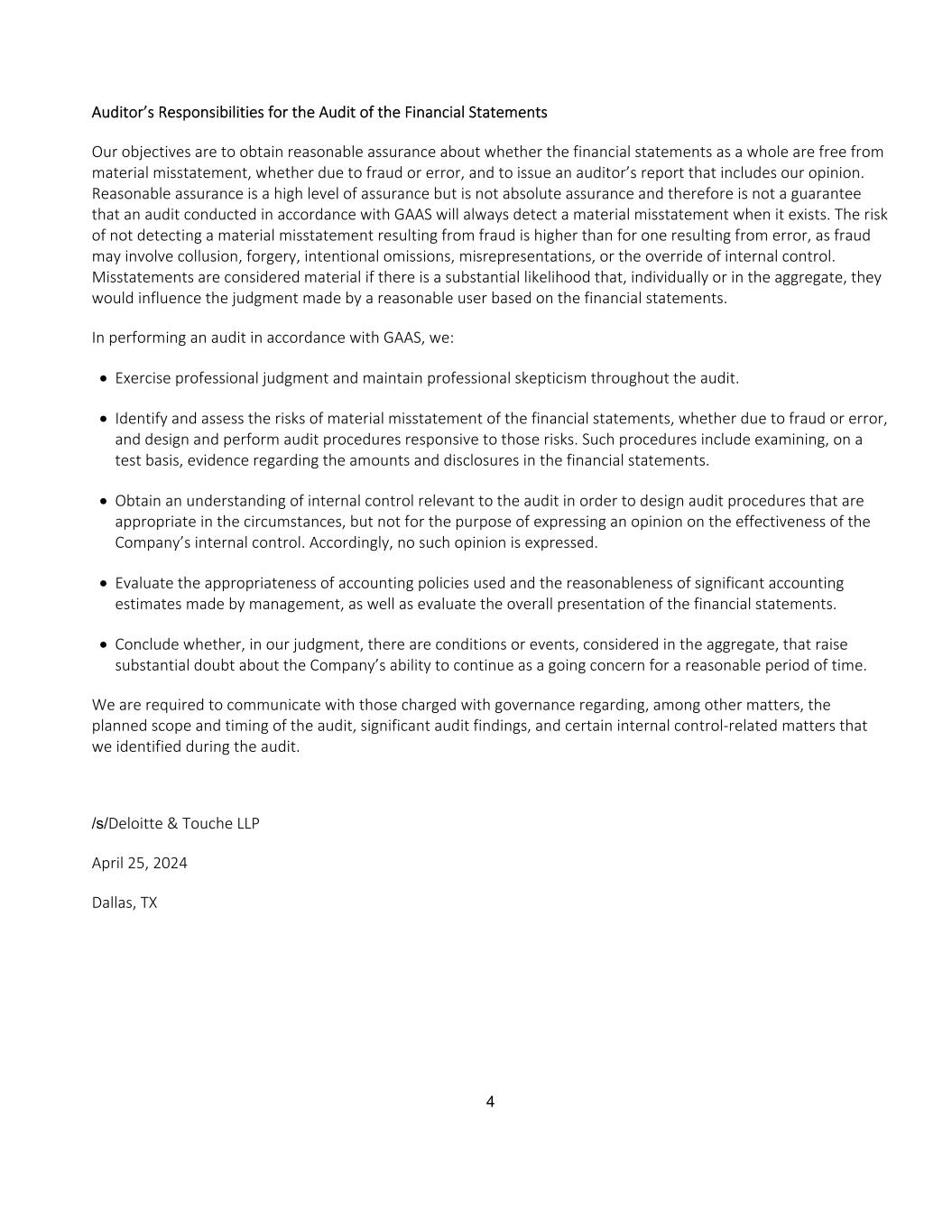 4 Auditor’s Responsibilities for the Audit of the Financial Statements Our objectives are to obtain reasonable assurance about whether the financial statements as a whole are free from material misstatement, whether due to fraud or error, and to issue an auditor’s report that includes our opinion. Reasonable assurance is a high level of assurance but is not absolute assurance and therefore is not a guarantee that an audit conducted in accordance with GAAS will always detect a material misstatement when it exists. The risk of not detecting a material misstatement resulting from fraud is higher than for one resulting from error, as fraud may involve collusion, forgery, intentional omissions, misrepresentations, or the override of internal control. Misstatements are considered material if there is a substantial likelihood that, individually or in the aggregate, they would influence the judgment made by a reasonable user based on the financial statements. In performing an audit in accordance with GAAS, we: Exercise professional judgment and maintain professional skepticism throughout the audit. Identify and assess the risks of material misstatement of the financial statements, whether due to fraud or error, and design and perform audit procedures responsive to those risks. Such procedures include examining, on a test basis, evidence regarding the amounts and disclosures in the financial statements. Obtain an understanding of internal control relevant to the audit in order to design audit procedures that are appropriate in the circumstances, but not for the purpose of expressing an opinion on the effectiveness of the Company’s internal control. Accordingly, no such opinion is expressed. Evaluate the appropriateness of accounting policies used and the reasonableness of significant accounting estimates made by management, as well as evaluate the overall presentation of the financial statements. Conclude whether, in our judgment, there are conditions or events, considered in the aggregate, that raise substantial doubt about the Company’s ability to continue as a going concern for a reasonable period of time. We are required to communicate with those charged with governance regarding, among other matters, the planned scope and timing of the audit, significant audit findings, and certain internal control-related matters that we identified during the audit. /s/Deloitte & Touche LLP April 25, 2024 Dallas, TX