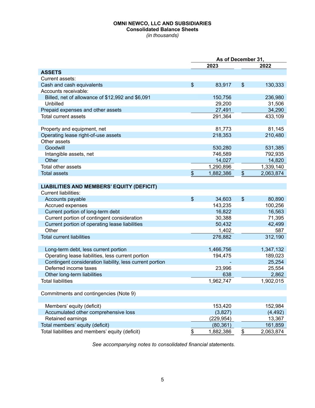 OMNI NEWCO, LLC AND SUBSIDIARIES Consolidated Balance Sheets (in thousands) 5 As of December 31, 2023 2022 ASSETS Current assets: Cash and cash equivalents $ 83,917 $ 130,333 Accounts receivable: Billed, net of allowance of $12,992 and $6,091 150,756 236,980 Unbilled 29,200 31,506 Prepaid expenses and other assets 27,491 34,290 Total current assets 291,364 433,109 Property and equipment, net 81,773 81,145 Operating lease right-of-use assets 218,353 210,480 Other assets Goodwill 530,280 531,385 Intangible assets, net 746,589 792,935 Other 14,027 14,820 Total other assets 1,290,896 1,339,140 Total assets $ 1,882,386 $ 2,063,874 LIABILITIES AND MEMBERS’ EQUITY (DEFICIT) Current liabilities: Accounts payable $ 34,603 $ 80,890 Accrued expenses 143,235 100,256 Current portion of long-term debt 16,822 16,563 Current portion of contingent consideration 30,388 71,395 Current portion of operating lease liabilities 50,432 42,499 Other 1,402 587 Total current liabilities 276,882 312,190 Long-term debt, less current portion 1,466,756 1,347,132 Operating lease liabilities, less current portion 194,475 189,023 Contingent consideration liability, less current portion - 25,254 Deferred income taxes 23,996 25,554 Other long-term liabilities 638 2,862 Total liabilities 1,962,747 1,902,015 Commitments and contingencies (Note 9) Members’ equity (deficit) 153,420 152,984 Accumulated other comprehensive loss (3,827) (4,492) Retained earnings (229,954) 13,367 Total members’ equity (deficit) (80,361) 161,859 Total liabilities and members’ equity (deficit) $ 1,882,386 $ 2,063,874 See accompanying notes to consolidated financial statements.