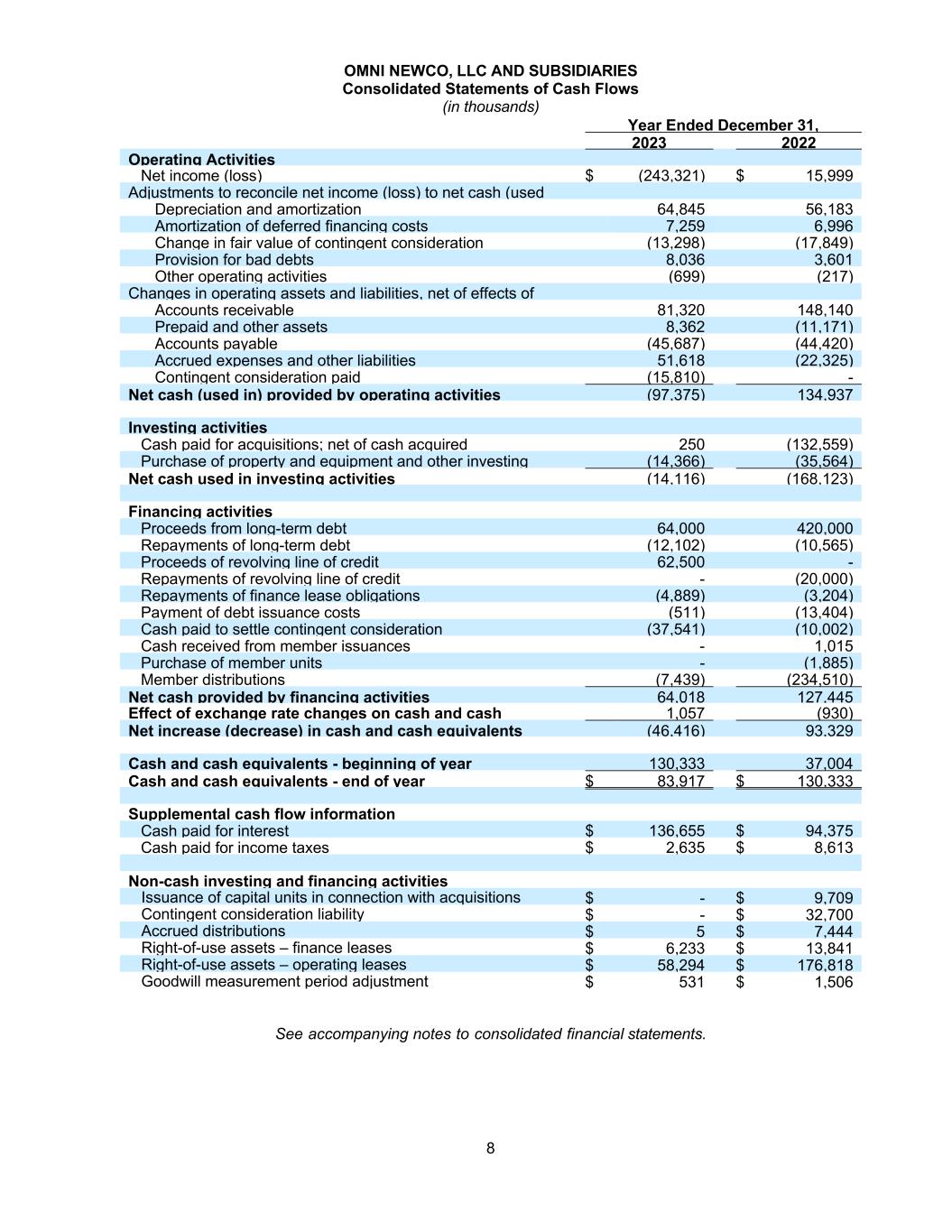 OMNI NEWCO, LLC AND SUBSIDIARIES Consolidated Statements of Cash Flows (in thousands) 8 Year Ended December 31, 2023 2022 Operating Activities Net income (loss) $ (243,321) $ 15,999 Adjustments to reconcile net income (loss) to net cash (used Depreciation and amortization 64,845 56,183 Amortization of deferred financing costs 7,259 6,996 Change in fair value of contingent consideration (13,298) (17,849) Provision for bad debts 8,036 3,601 Other operating activities (699) (217) Changes in operating assets and liabilities, net of effects of Accounts receivable 81,320 148,140 Prepaid and other assets 8,362 (11,171) Accounts payable (45,687) (44,420) Accrued expenses and other liabilities 51,618 (22,325) Contingent consideration paid (15,810) - Net cash (used in) provided by operating activities (97,375) 134,937 Investing activities Cash paid for acquisitions; net of cash acquired 250 (132,559) Purchase of property and equipment and other investing (14,366) (35,564) Net cash used in investing activities (14,116) (168,123) Financing activities Proceeds from long-term debt 64,000 420,000 Repayments of long-term debt (12,102) (10,565) Proceeds of revolving line of credit 62,500 - Repayments of revolving line of credit - (20,000) Repayments of finance lease obligations (4,889) (3,204) Payment of debt issuance costs (511) (13,404) Cash paid to settle contingent consideration (37,541) (10,002) Cash received from member issuances - 1,015 Purchase of member units - (1,885) Member distributions (7,439) (234,510) Net cash provided by financing activities 64,018 127,445 Effect of exchange rate changes on cash and cash 1,057 (930) Net increase (decrease) in cash and cash equivalents (46,416) 93,329 Cash and cash equivalents - beginning of year 130,333 37,004 Cash and cash equivalents - end of year $ 83,917 $ 130,333 Supplemental cash flow information Cash paid for interest $ 136,655 $ 94,375 Cash paid for income taxes $ 2,635 $ 8,613 Non-cash investing and financing activities Issuance of capital units in connection with acquisitions $ - $ 9,709 Contingent consideration liability $ - $ 32,700 Accrued distributions $ 5 $ 7,444 Right-of-use assets – finance leases $ 6,233 $ 13,841 Right-of-use assets – operating leases $ 58,294 $ 176,818 Goodwill measurement period adjustment $ 531 $ 1,506 See accompanying notes to consolidated financial statements.