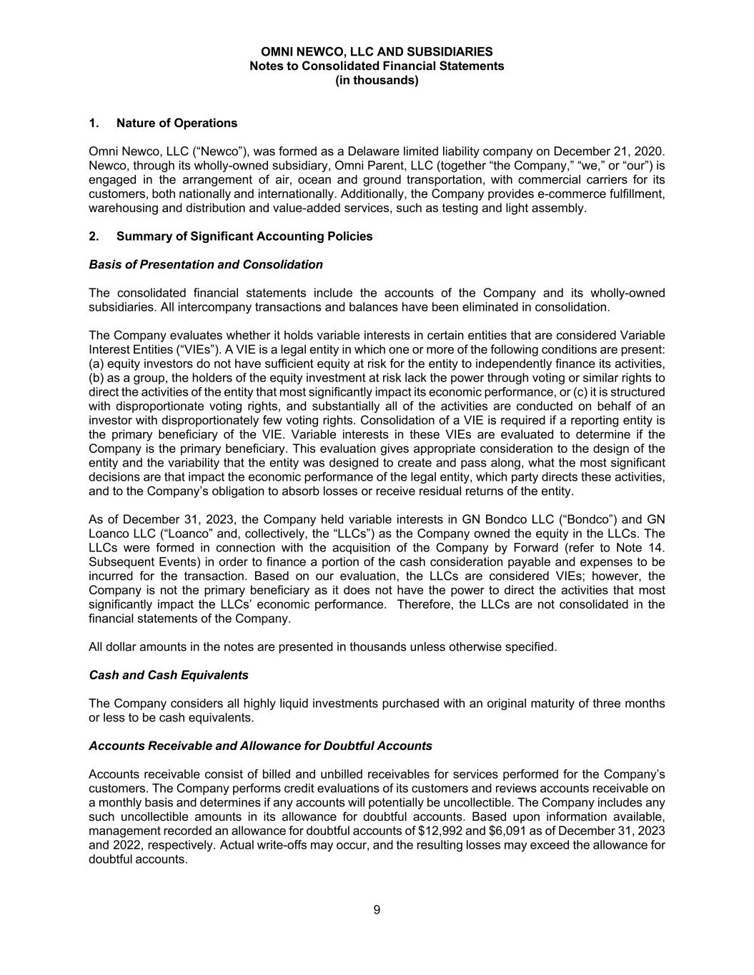 OMNI NEWCO, LLC AND SUBSIDIARIES Notes to Consolidated Financial Statements (in thousands) 9 1. Nature of Operations Omni Newco, LLC (“Newco”), was formed as a Delaware limited liability company on December 21, 2020. Newco, through its wholly-owned subsidiary, Omni Parent, LLC (together “the Company,” “we,” or “our”) is engaged in the arrangement of air, ocean and ground transportation, with commercial carriers for its customers, both nationally and internationally. Additionally, the Company provides e-commerce fulfillment, warehousing and distribution and value-added services, such as testing and light assembly. 2. Summary of Significant Accounting Policies Basis of Presentation and Consolidation The consolidated financial statements include the accounts of the Company and its wholly-owned subsidiaries. All intercompany transactions and balances have been eliminated in consolidation. The Company evaluates whether it holds variable interests in certain entities that are considered Variable Interest Entities (“VIEs”). A VIE is a legal entity in which one or more of the following conditions are present: (a) equity investors do not have sufficient equity at risk for the entity to independently finance its activities, (b) as a group, the holders of the equity investment at risk lack the power through voting or similar rights to direct the activities of the entity that most significantly impact its economic performance, or (c) it is structured with disproportionate voting rights, and substantially all of the activities are conducted on behalf of an investor with disproportionately few voting rights. Consolidation of a VIE is required if a reporting entity is the primary beneficiary of the VIE. Variable interests in these VIEs are evaluated to determine if the Company is the primary beneficiary. This evaluation gives appropriate consideration to the design of the entity and the variability that the entity was designed to create and pass along, what the most significant decisions are that impact the economic performance of the legal entity, which party directs these activities, and to the Company’s obligation to absorb losses or receive residual returns of the entity. As of December 31, 2023, the Company held variable interests in GN Bondco LLC (“Bondco”) and GN Loanco LLC (“Loanco” and, collectively, the “LLCs”) as the Company owned the equity in the LLCs. The LLCs were formed in connection with the acquisition of the Company by Forward (refer to Note 14. Subsequent Events) in order to finance a portion of the cash consideration payable and expenses to be incurred for the transaction. Based on our evaluation, the LLCs are considered VIEs; however, the Company is not the primary beneficiary as it does not have the power to direct the activities that most significantly impact the LLCs’ economic performance. Therefore, the LLCs are not consolidated in the financial statements of the Company. All dollar amounts in the notes are presented in thousands unless otherwise specified. Cash and Cash Equivalents The Company considers all highly liquid investments purchased with an original maturity of three months or less to be cash equivalents. Accounts Receivable and Allowance for Doubtful Accounts Accounts receivable consist of billed and unbilled receivables for services performed for the Company’s customers. The Company performs credit evaluations of its customers and reviews accounts receivable on a monthly basis and determines if any accounts will potentially be uncollectible. The Company includes any such uncollectible amounts in its allowance for doubtful accounts. Based upon information available, management recorded an allowance for doubtful accounts of $12,992 and $6,091 as of December 31, 2023 and 2022, respectively. Actual write-offs may occur, and the resulting losses may exceed the allowance for doubtful accounts.