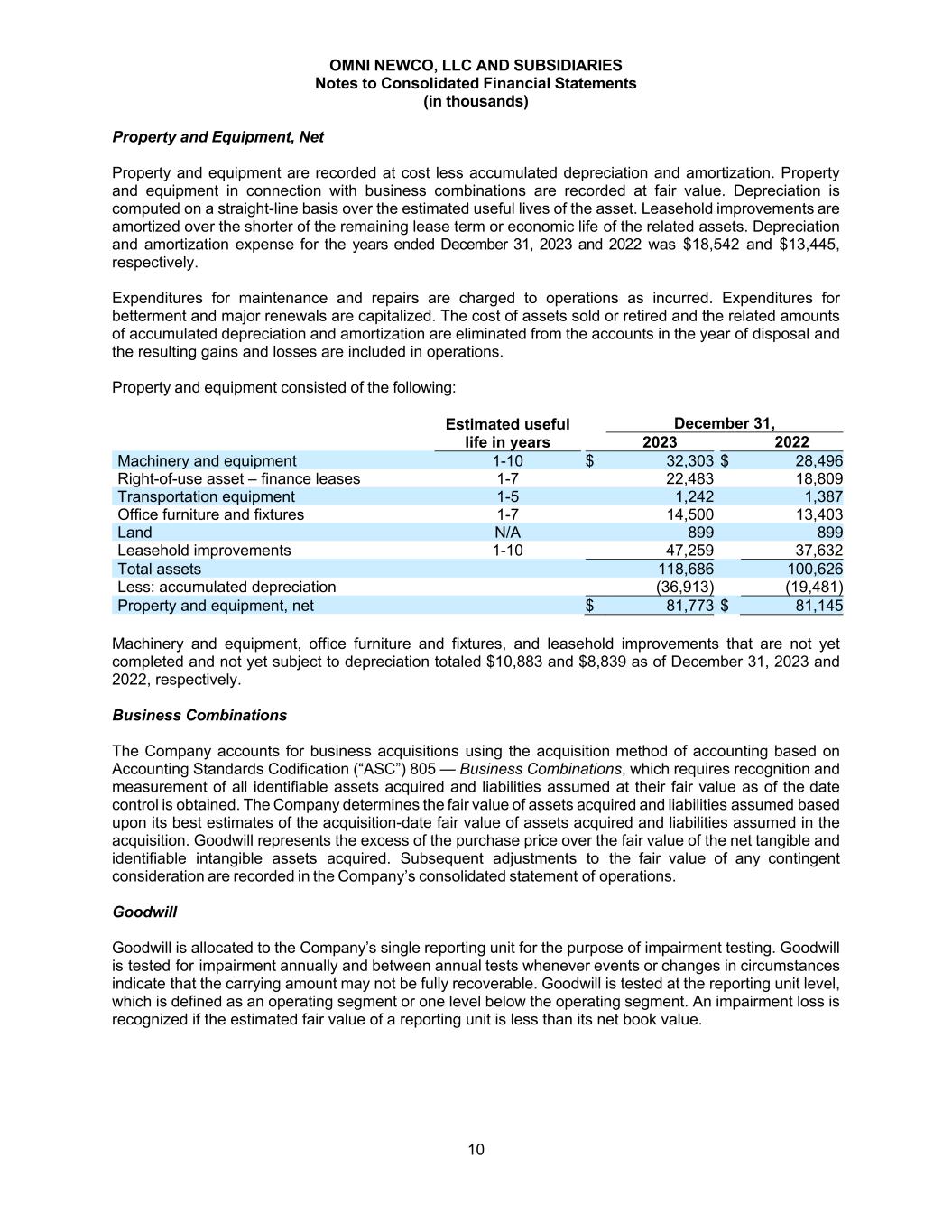 OMNI NEWCO, LLC AND SUBSIDIARIES Notes to Consolidated Financial Statements (in thousands) 10 Property and Equipment, Net Property and equipment are recorded at cost less accumulated depreciation and amortization. Property and equipment in connection with business combinations are recorded at fair value. Depreciation is computed on a straight-line basis over the estimated useful lives of the asset. Leasehold improvements are amortized over the shorter of the remaining lease term or economic life of the related assets. Depreciation and amortization expense for the years ended December 31, 2023 and 2022 was $18,542 and $13,445, respectively. Expenditures for maintenance and repairs are charged to operations as incurred. Expenditures for betterment and major renewals are capitalized. The cost of assets sold or retired and the related amounts of accumulated depreciation and amortization are eliminated from the accounts in the year of disposal and the resulting gains and losses are included in operations. Property and equipment consisted of the following: Estimated useful life in years December 31, 2023 2022 Machinery and equipment 1-10 $ 32,303 $ 28,496 Right-of-use asset – finance leases 1-7 22,483 18,809 Transportation equipment 1-5 1,242 1,387 Office furniture and fixtures 1-7 14,500 13,403 Land N/A 899 899 Leasehold improvements 1-10 47,259 37,632 Total assets 118,686 100,626 Less: accumulated depreciation (36,913) (19,481) Property and equipment, net $ 81,773 $ 81,145 Machinery and equipment, office furniture and fixtures, and leasehold improvements that are not yet completed and not yet subject to depreciation totaled $10,883 and $8,839 as of December 31, 2023 and 2022, respectively. Business Combinations The Company accounts for business acquisitions using the acquisition method of accounting based on Accounting Standards Codification (“ASC”) 805 — Business Combinations, which requires recognition and measurement of all identifiable assets acquired and liabilities assumed at their fair value as of the date control is obtained. The Company determines the fair value of assets acquired and liabilities assumed based upon its best estimates of the acquisition-date fair value of assets acquired and liabilities assumed in the acquisition. Goodwill represents the excess of the purchase price over the fair value of the net tangible and identifiable intangible assets acquired. Subsequent adjustments to the fair value of any contingent consideration are recorded in the Company’s consolidated statement of operations. Goodwill Goodwill is allocated to the Company’s single reporting unit for the purpose of impairment testing. Goodwill is tested for impairment annually and between annual tests whenever events or changes in circumstances indicate that the carrying amount may not be fully recoverable. Goodwill is tested at the reporting unit level, which is defined as an operating segment or one level below the operating segment. An impairment loss is recognized if the estimated fair value of a reporting unit is less than its net book value.