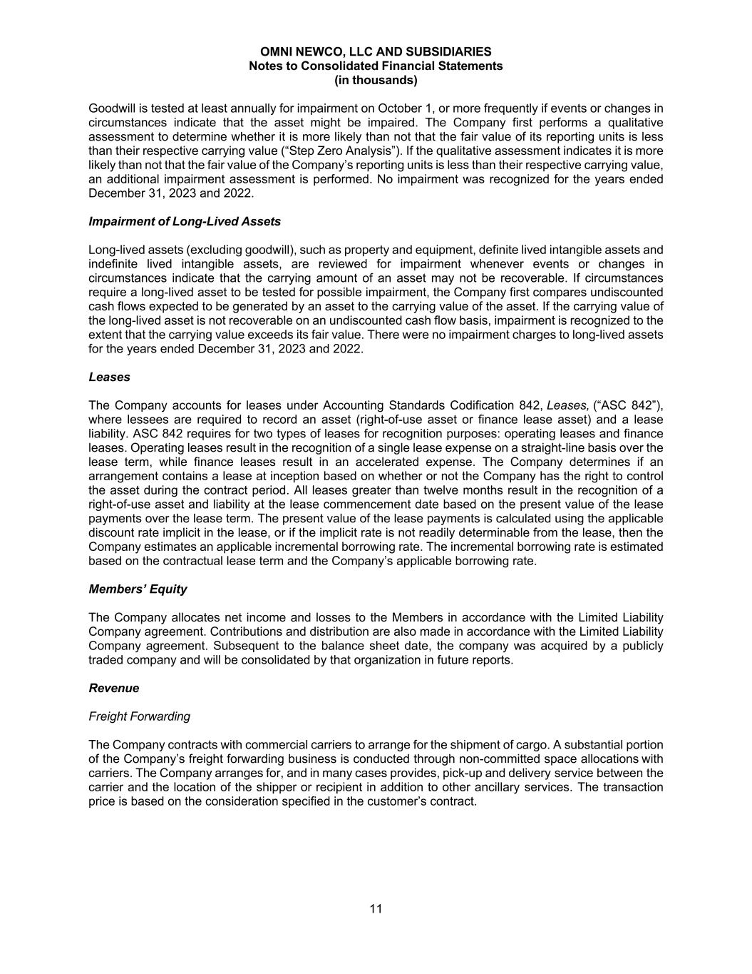OMNI NEWCO, LLC AND SUBSIDIARIES Notes to Consolidated Financial Statements (in thousands) 11 Goodwill is tested at least annually for impairment on October 1, or more frequently if events or changes in circumstances indicate that the asset might be impaired. The Company first performs a qualitative assessment to determine whether it is more likely than not that the fair value of its reporting units is less than their respective carrying value (“Step Zero Analysis”). If the qualitative assessment indicates it is more likely than not that the fair value of the Company’s reporting units is less than their respective carrying value, an additional impairment assessment is performed. No impairment was recognized for the years ended December 31, 2023 and 2022. Impairment of Long-Lived Assets Long-lived assets (excluding goodwill), such as property and equipment, definite lived intangible assets and indefinite lived intangible assets, are reviewed for impairment whenever events or changes in circumstances indicate that the carrying amount of an asset may not be recoverable. If circumstances require a long-lived asset to be tested for possible impairment, the Company first compares undiscounted cash flows expected to be generated by an asset to the carrying value of the asset. If the carrying value of the long-lived asset is not recoverable on an undiscounted cash flow basis, impairment is recognized to the extent that the carrying value exceeds its fair value. There were no impairment charges to long-lived assets for the years ended December 31, 2023 and 2022. Leases The Company accounts for leases under Accounting Standards Codification 842, Leases, (“ASC 842”), where lessees are required to record an asset (right-of-use asset or finance lease asset) and a lease liability. ASC 842 requires for two types of leases for recognition purposes: operating leases and finance leases. Operating leases result in the recognition of a single lease expense on a straight-line basis over the lease term, while finance leases result in an accelerated expense. The Company determines if an arrangement contains a lease at inception based on whether or not the Company has the right to control the asset during the contract period. All leases greater than twelve months result in the recognition of a right-of-use asset and liability at the lease commencement date based on the present value of the lease payments over the lease term. The present value of the lease payments is calculated using the applicable discount rate implicit in the lease, or if the implicit rate is not readily determinable from the lease, then the Company estimates an applicable incremental borrowing rate. The incremental borrowing rate is estimated based on the contractual lease term and the Company’s applicable borrowing rate. Members’ Equity The Company allocates net income and losses to the Members in accordance with the Limited Liability Company agreement. Contributions and distribution are also made in accordance with the Limited Liability Company agreement. Subsequent to the balance sheet date, the company was acquired by a publicly traded company and will be consolidated by that organization in future reports. Revenue Freight Forwarding The Company contracts with commercial carriers to arrange for the shipment of cargo. A substantial portion of the Company’s freight forwarding business is conducted through non-committed space allocations with carriers. The Company arranges for, and in many cases provides, pick-up and delivery service between the carrier and the location of the shipper or recipient in addition to other ancillary services. The transaction price is based on the consideration specified in the customer’s contract.