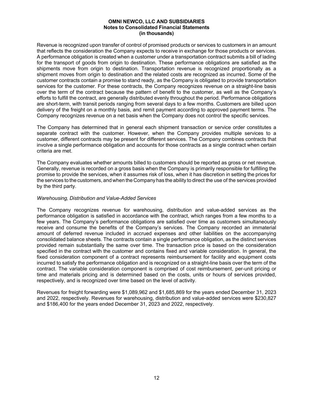 OMNI NEWCO, LLC AND SUBSIDIARIES Notes to Consolidated Financial Statements (in thousands) 12 Revenue is recognized upon transfer of control of promised products or services to customers in an amount that reflects the consideration the Company expects to receive in exchange for those products or services. A performance obligation is created when a customer under a transportation contract submits a bill of lading for the transport of goods from origin to destination. These performance obligations are satisfied as the shipments move from origin to destination. Transportation revenue is recognized proportionally as a shipment moves from origin to destination and the related costs are recognized as incurred. Some of the customer contracts contain a promise to stand ready, as the Company is obligated to provide transportation services for the customer. For these contracts, the Company recognizes revenue on a straight-line basis over the term of the contract because the pattern of benefit to the customer, as well as the Company’s efforts to fulfill the contract, are generally distributed evenly throughout the period. Performance obligations are short-term, with transit periods ranging from several days to a few months. Customers are billed upon delivery of the freight on a monthly basis, and remit payment according to approved payment terms. The Company recognizes revenue on a net basis when the Company does not control the specific services. The Company has determined that in general each shipment transaction or service order constitutes a separate contract with the customer. However, when the Company provides multiple services to a customer, different contracts may be present for different services. The Company combines contracts that involve a single performance obligation and accounts for those contracts as a single contract when certain criteria are met. The Company evaluates whether amounts billed to customers should be reported as gross or net revenue. Generally, revenue is recorded on a gross basis when the Company is primarily responsible for fulfilling the promise to provide the services, when it assumes risk of loss, when it has discretion in setting the prices for the services to the customers, and when the Company has the ability to direct the use of the services provided by the third party. Warehousing, Distribution and Value-Added Services The Company recognizes revenue for warehousing, distribution and value-added services as the performance obligation is satisfied in accordance with the contract, which ranges from a few months to a few years. The Company’s performance obligations are satisfied over time as customers simultaneously receive and consume the benefits of the Company’s services. The Company recorded an immaterial amount of deferred revenue included in accrued expenses and other liabilities on the accompanying consolidated balance sheets. The contracts contain a single performance obligation, as the distinct services provided remain substantially the same over time. The transaction price is based on the consideration specified in the contract with the customer and contains fixed and variable consideration. In general, the fixed consideration component of a contract represents reimbursement for facility and equipment costs incurred to satisfy the performance obligation and is recognized on a straight-line basis over the term of the contract. The variable consideration component is comprised of cost reimbursement, per-unit pricing or time and materials pricing and is determined based on the costs, units or hours of services provided, respectively, and is recognized over time based on the level of activity. Revenues for freight forwarding were $1,089,962 and $1,685,869 for the years ended December 31, 2023 and 2022, respectively. Revenues for warehousing, distribution and value-added services were $230,827 and $186,400 for the years ended December 31, 2023 and 2022, respectively.