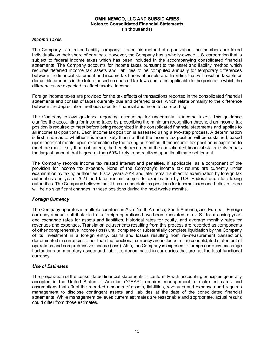 OMNI NEWCO, LLC AND SUBSIDIARIES Notes to Consolidated Financial Statements (in thousands) 13 Income Taxes The Company is a limited liability company. Under this method of organization, the members are taxed individually on their share of earnings. However, the Company has a wholly-owned U.S. corporation that is subject to federal income taxes which has been included in the accompanying consolidated financial statements. The Company accounts for income taxes pursuant to the asset and liability method which requires deferred income tax assets and liabilities to be computed annually for temporary differences between the financial statement and income tax bases of assets and liabilities that will result in taxable or deductible amounts in the future based on enacted tax laws and rates applicable to the periods in which the differences are expected to affect taxable income. Foreign income taxes are provided for the tax effects of transactions reported in the consolidated financial statements and consist of taxes currently due and deferred taxes, which relate primarily to the difference between the depreciation methods used for financial and income tax reporting. The Company follows guidance regarding accounting for uncertainty in income taxes. This guidance clarifies the accounting for income taxes by prescribing the minimum recognition threshold an income tax position is required to meet before being recognized in the consolidated financial statements and applies to all income tax positions. Each income tax position is assessed using a two-step process. A determination is first made as to whether it is more likely than not that the income tax position will be sustained, based upon technical merits, upon examination by the taxing authorities. If the income tax position is expected to meet the more likely than not criteria, the benefit recorded in the consolidated financial statements equals the largest amount that is greater than 50% likely to be realized upon its ultimate settlement. The Company records income tax related interest and penalties, if applicable, as a component of the provision for income tax expense. None of the Company’s income tax returns are currently under examination by taxing authorities. Fiscal years 2014 and later remain subject to examination by foreign tax authorities and years 2021 and later remain subject to examination by U.S. Federal and state taxing authorities. The Company believes that it has no uncertain tax positions for income taxes and believes there will be no significant changes in these positions during the next twelve months. Foreign Currency The Company operates in multiple countries in Asia, North America, South America, and Europe. Foreign currency amounts attributable to its foreign operations have been translated into U.S. dollars using year- end exchange rates for assets and liabilities, historical rates for equity, and average monthly rates for revenues and expenses. Translation adjustments resulting from this process are recorded as components of other comprehensive income (loss) until complete or substantially complete liquidation by the Company of its investment in a foreign entity. Gains and losses resulting from re-measurement transactions denominated in currencies other than the functional currency are included in the consolidated statement of operations and comprehensive income (loss). Also, the Company is exposed to foreign currency exchange fluctuations on monetary assets and liabilities denominated in currencies that are not the local functional currency. Use of Estimates The preparation of the consolidated financial statements in conformity with accounting principles generally accepted in the United States of America (“GAAP”) requires management to make estimates and assumptions that affect the reported amounts of assets, liabilities, revenues and expenses and requires management to disclose contingent assets and liabilities at the date of the consolidated financial statements. While management believes current estimates are reasonable and appropriate, actual results could differ from those estimates.