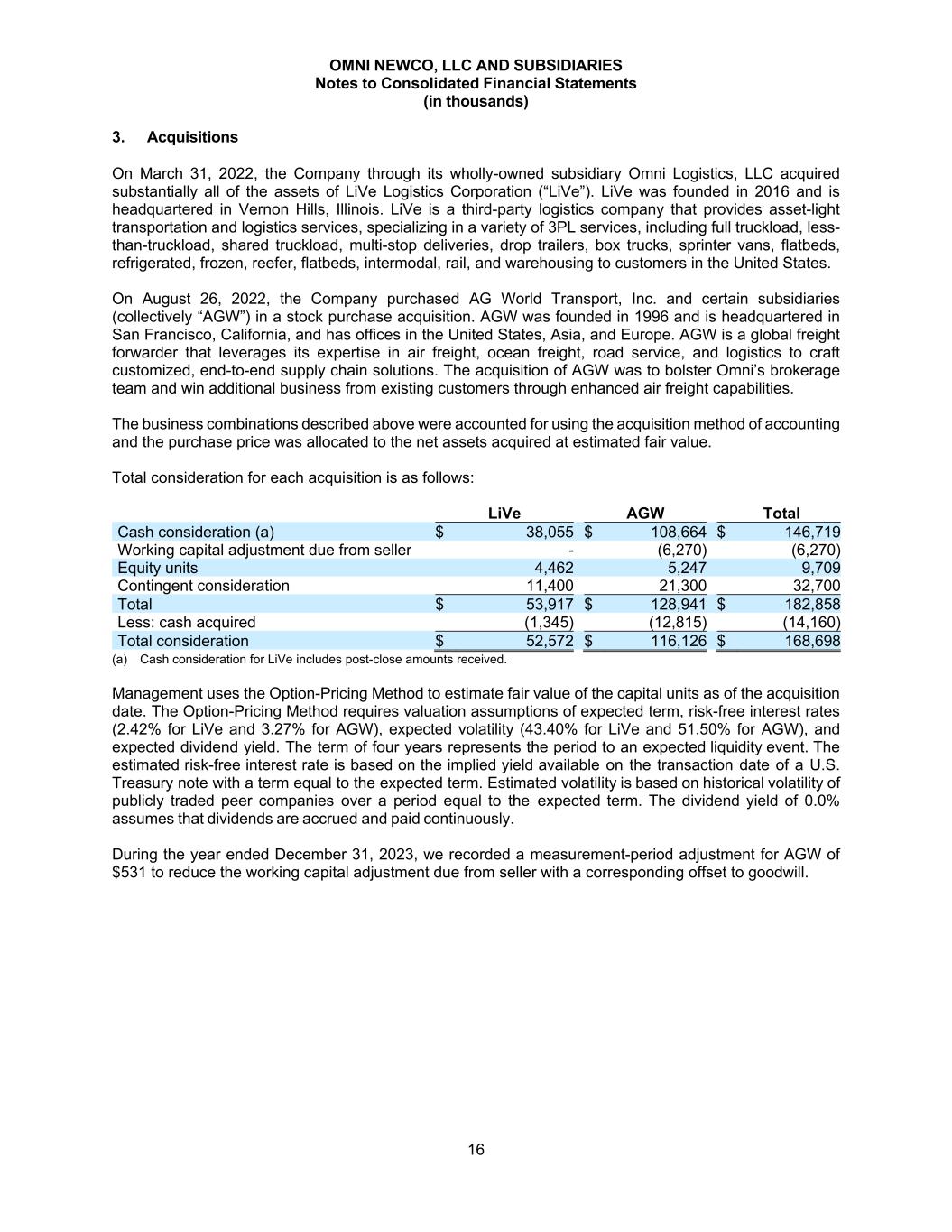 OMNI NEWCO, LLC AND SUBSIDIARIES Notes to Consolidated Financial Statements (in thousands) 16 3. Acquisitions On March 31, 2022, the Company through its wholly-owned subsidiary Omni Logistics, LLC acquired substantially all of the assets of LiVe Logistics Corporation (“LiVe”). LiVe was founded in 2016 and is headquartered in Vernon Hills, Illinois. LiVe is a third-party logistics company that provides asset-light transportation and logistics services, specializing in a variety of 3PL services, including full truckload, less- than-truckload, shared truckload, multi-stop deliveries, drop trailers, box trucks, sprinter vans, flatbeds, refrigerated, frozen, reefer, flatbeds, intermodal, rail, and warehousing to customers in the United States. On August 26, 2022, the Company purchased AG World Transport, Inc. and certain subsidiaries (collectively “AGW”) in a stock purchase acquisition. AGW was founded in 1996 and is headquartered in San Francisco, California, and has offices in the United States, Asia, and Europe. AGW is a global freight forwarder that leverages its expertise in air freight, ocean freight, road service, and logistics to craft customized, end-to-end supply chain solutions. The acquisition of AGW was to bolster Omni’s brokerage team and win additional business from existing customers through enhanced air freight capabilities. The business combinations described above were accounted for using the acquisition method of accounting and the purchase price was allocated to the net assets acquired at estimated fair value. Total consideration for each acquisition is as follows: LiVe AGW Total Cash consideration (a) $ 38,055 $ 108,664 $ 146,719 Working capital adjustment due from seller - (6,270) (6,270) Equity units 4,462 5,247 9,709 Contingent consideration 11,400 21,300 32,700 Total $ 53,917 $ 128,941 $ 182,858 Less: cash acquired (1,345) (12,815) (14,160) Total consideration $ 52,572 $ 116,126 $ 168,698 (a) Cash consideration for LiVe includes post-close amounts received. Management uses the Option-Pricing Method to estimate fair value of the capital units as of the acquisition date. The Option-Pricing Method requires valuation assumptions of expected term, risk-free interest rates (2.42% for LiVe and 3.27% for AGW), expected volatility (43.40% for LiVe and 51.50% for AGW), and expected dividend yield. The term of four years represents the period to an expected liquidity event. The estimated risk-free interest rate is based on the implied yield available on the transaction date of a U.S. Treasury note with a term equal to the expected term. Estimated volatility is based on historical volatility of publicly traded peer companies over a period equal to the expected term. The dividend yield of 0.0% assumes that dividends are accrued and paid continuously. During the year ended December 31, 2023, we recorded a measurement-period adjustment for AGW of $531 to reduce the working capital adjustment due from seller with a corresponding offset to goodwill.