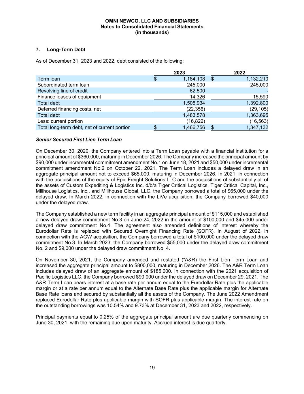 OMNI NEWCO, LLC AND SUBSIDIARIES Notes to Consolidated Financial Statements (in thousands) 19 7. Long-Term Debt As of December 31, 2023 and 2022, debt consisted of the following: 2023 2022 Term loan $ 1,184,108 $ 1,132,210 Subordinated term loan 245,000 245,000 Revolving line of credit 62,500 - Finance leases of equipment 14,326 15,590 Total debt 1,505,934 1,392,800 Deferred financing costs, net (22,356) (29,105) Total debt 1,483,578 1,363,695 Less: current portion (16,822) (16,563) Total long-term debt, net of current portion $ 1,466,756 $ 1,347,132 Senior Secured First Lien Term Loan On December 30, 2020, the Company entered into a Term Loan payable with a financial institution for a principal amount of $360,000, maturing in December 2026. The Company increased the principal amount by $90,000 under incremental commitment amendment No.1 on June 18, 2021 and $50,000 under incremental commitment amendment No.2 on October 22, 2021. The Term Loan includes a delayed draw in an aggregate principal amount not to exceed $65,000, maturing in December 2026. In 2021, in connection with the acquisitions of the equity of Epic Freight Solutions LLC and the acquisitions of substantially all of the assets of Custom Expediting & Logistics Inc. d/b/a Tiger Critical Logistics, Tiger Critical Capital, Inc., Millhouse Logistics, Inc., and Millhouse Global, LLC, the Company borrowed a total of $65,000 under the delayed draw. In March 2022, in connection with the LiVe acquisition, the Company borrowed $40,000 under the delayed draw. The Company established a new term facility in an aggregate principal amount of $115,000 and established a new delayed draw commitment No.3 on June 24, 2022 in the amount of $100,000 and $45,000 under delayed draw commitment No.4. The agreement also amended definitions of interest whereby the Eurodollar Rate is replaced with Secured Overnight Financing Rate (SOFR). In August of 2022, in connection with the AGW acquisition, the Company borrowed a total of $100,000 under the delayed draw commitment No.3. In March 2023, the Company borrowed $55,000 under the delayed draw commitment No. 2 and $9,000 under the delayed draw commitment No. 4. On November 30, 2021, the Company amended and restated (“A&R) the First Lien Term Loan and increased the aggregate principal amount to $800,000, maturing in December 2026. The A&R Term Loan includes delayed draw of an aggregate amount of $185,000. In connection with the 2021 acquisition of Pacific Logistics LLC, the Company borrowed $90,000 under the delayed draw on December 29, 2021. The A&R Term Loan bears interest at a base rate per annum equal to the Eurodollar Rate plus the applicable margin or at a rate per annum equal to the Alternate Base Rate plus the applicable margin for Alternate Base Rate loans and secured by substantially all the assets of the Company. The June 2022 Amendment replaced Eurodollar Rate plus applicable margin with SOFR plus applicable margin. The interest rate on the outstanding borrowings was 10.54% and 9.73% at December 31, 2023 and 2022, respectively. Principal payments equal to 0.25% of the aggregate principal amount are due quarterly commencing on June 30, 2021, with the remaining due upon maturity. Accrued interest is due quarterly.