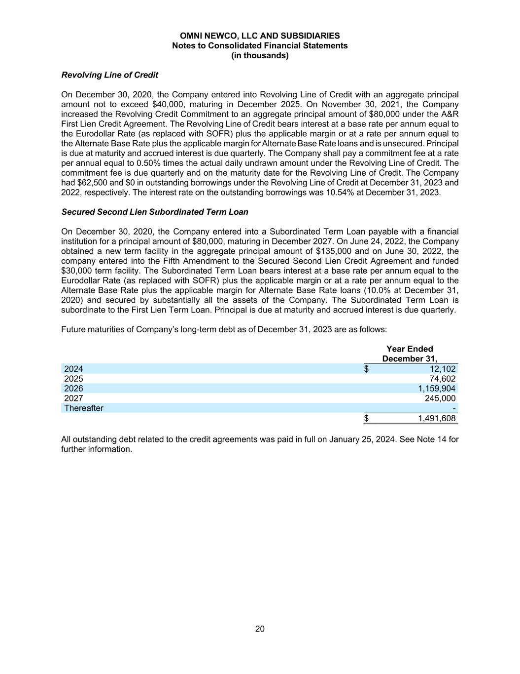 OMNI NEWCO, LLC AND SUBSIDIARIES Notes to Consolidated Financial Statements (in thousands) 20 Revolving Line of Credit On December 30, 2020, the Company entered into Revolving Line of Credit with an aggregate principal amount not to exceed $40,000, maturing in December 2025. On November 30, 2021, the Company increased the Revolving Credit Commitment to an aggregate principal amount of $80,000 under the A&R First Lien Credit Agreement. The Revolving Line of Credit bears interest at a base rate per annum equal to the Eurodollar Rate (as replaced with SOFR) plus the applicable margin or at a rate per annum equal to the Alternate Base Rate plus the applicable margin for Alternate Base Rate loans and is unsecured. Principal is due at maturity and accrued interest is due quarterly. The Company shall pay a commitment fee at a rate per annual equal to 0.50% times the actual daily undrawn amount under the Revolving Line of Credit. The commitment fee is due quarterly and on the maturity date for the Revolving Line of Credit. The Company had $62,500 and $0 in outstanding borrowings under the Revolving Line of Credit at December 31, 2023 and 2022, respectively. The interest rate on the outstanding borrowings was 10.54% at December 31, 2023. Secured Second Lien Subordinated Term Loan On December 30, 2020, the Company entered into a Subordinated Term Loan payable with a financial institution for a principal amount of $80,000, maturing in December 2027. On June 24, 2022, the Company obtained a new term facility in the aggregate principal amount of $135,000 and on June 30, 2022, the company entered into the Fifth Amendment to the Secured Second Lien Credit Agreement and funded $30,000 term facility. The Subordinated Term Loan bears interest at a base rate per annum equal to the Eurodollar Rate (as replaced with SOFR) plus the applicable margin or at a rate per annum equal to the Alternate Base Rate plus the applicable margin for Alternate Base Rate loans (10.0% at December 31, 2020) and secured by substantially all the assets of the Company. The Subordinated Term Loan is subordinate to the First Lien Term Loan. Principal is due at maturity and accrued interest is due quarterly. Future maturities of Company’s long-term debt as of December 31, 2023 are as follows: Year Ended December 31, 2024 $ 12,102 2025 74,602 2026 1,159,904 2027 245,000 Thereafter - $ 1,491,608 All outstanding debt related to the credit agreements was paid in full on January 25, 2024. See Note 14 for further information.