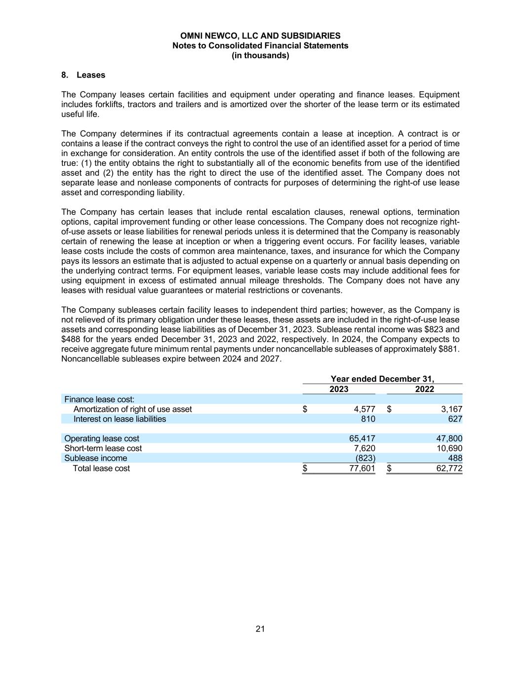 OMNI NEWCO, LLC AND SUBSIDIARIES Notes to Consolidated Financial Statements (in thousands) 21 8. Leases The Company leases certain facilities and equipment under operating and finance leases. Equipment includes forklifts, tractors and trailers and is amortized over the shorter of the lease term or its estimated useful life. The Company determines if its contractual agreements contain a lease at inception. A contract is or contains a lease if the contract conveys the right to control the use of an identified asset for a period of time in exchange for consideration. An entity controls the use of the identified asset if both of the following are true: (1) the entity obtains the right to substantially all of the economic benefits from use of the identified asset and (2) the entity has the right to direct the use of the identified asset. The Company does not separate lease and nonlease components of contracts for purposes of determining the right-of use lease asset and corresponding liability. The Company has certain leases that include rental escalation clauses, renewal options, termination options, capital improvement funding or other lease concessions. The Company does not recognize right- of-use assets or lease liabilities for renewal periods unless it is determined that the Company is reasonably certain of renewing the lease at inception or when a triggering event occurs. For facility leases, variable lease costs include the costs of common area maintenance, taxes, and insurance for which the Company pays its lessors an estimate that is adjusted to actual expense on a quarterly or annual basis depending on the underlying contract terms. For equipment leases, variable lease costs may include additional fees for using equipment in excess of estimated annual mileage thresholds. The Company does not have any leases with residual value guarantees or material restrictions or covenants. The Company subleases certain facility leases to independent third parties; however, as the Company is not relieved of its primary obligation under these leases, these assets are included in the right-of-use lease assets and corresponding lease liabilities as of December 31, 2023. Sublease rental income was $823 and $488 for the years ended December 31, 2023 and 2022, respectively. In 2024, the Company expects to receive aggregate future minimum rental payments under noncancellable subleases of approximately $881. Noncancellable subleases expire between 2024 and 2027. Year ended December 31, 2023 2022 Finance lease cost: Amortization of right of use asset $ 4,577 $ 3,167 Interest on lease liabilities 810 627 Operating lease cost 65,417 47,800 Short-term lease cost 7,620 10,690 Sublease income (823) 488 Total lease cost $ 77,601 $ 62,772