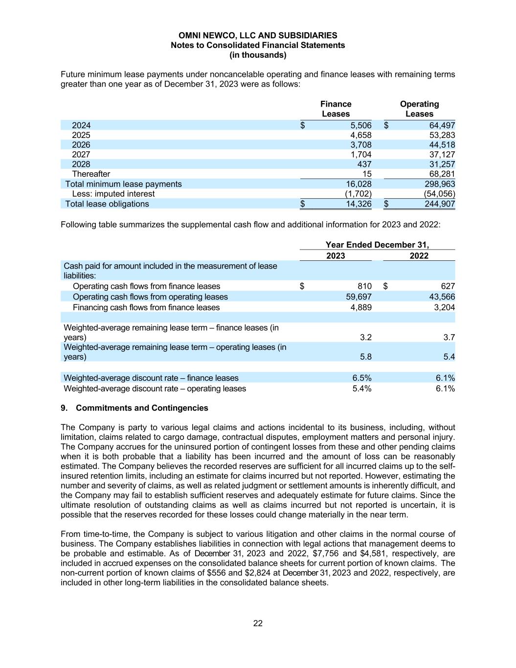 OMNI NEWCO, LLC AND SUBSIDIARIES Notes to Consolidated Financial Statements (in thousands) 22 Future minimum lease payments under noncancelable operating and finance leases with remaining terms greater than one year as of December 31, 2023 were as follows: Finance Leases Operating Leases 2024 $ 5,506 $ 64,497 2025 4,658 53,283 2026 3,708 44,518 2027 1,704 37,127 2028 437 31,257 Thereafter 15 68,281 Total minimum lease payments 16,028 298,963 Less: imputed interest (1,702) (54,056) Total lease obligations $ 14,326 $ 244,907 Following table summarizes the supplemental cash flow and additional information for 2023 and 2022: Year Ended December 31, 2023 2022 Cash paid for amount included in the measurement of lease liabilities: Operating cash flows from finance leases $ 810 $ 627 Operating cash flows from operating leases 59,697 43,566 Financing cash flows from finance leases 4,889 3,204 Weighted-average remaining lease term – finance leases (in years) 3.2 3.7 Weighted-average remaining lease term – operating leases (in years) 5.8 5.4 Weighted-average discount rate – finance leases 6.5% 6.1% Weighted-average discount rate – operating leases 5.4% 6.1% 9. Commitments and Contingencies The Company is party to various legal claims and actions incidental to its business, including, without limitation, claims related to cargo damage, contractual disputes, employment matters and personal injury. The Company accrues for the uninsured portion of contingent losses from these and other pending claims when it is both probable that a liability has been incurred and the amount of loss can be reasonably estimated. The Company believes the recorded reserves are sufficient for all incurred claims up to the self- insured retention limits, including an estimate for claims incurred but not reported. However, estimating the number and severity of claims, as well as related judgment or settlement amounts is inherently difficult, and the Company may fail to establish sufficient reserves and adequately estimate for future claims. Since the ultimate resolution of outstanding claims as well as claims incurred but not reported is uncertain, it is possible that the reserves recorded for these losses could change materially in the near term. From time-to-time, the Company is subject to various litigation and other claims in the normal course of business. The Company establishes liabilities in connection with legal actions that management deems to be probable and estimable. As of December 31, 2023 and 2022, $7,756 and $4,581, respectively, are included in accrued expenses on the consolidated balance sheets for current portion of known claims. The non-current portion of known claims of $556 and $2,824 at December 31, 2023 and 2022, respectively, are included in other long-term liabilities in the consolidated balance sheets.