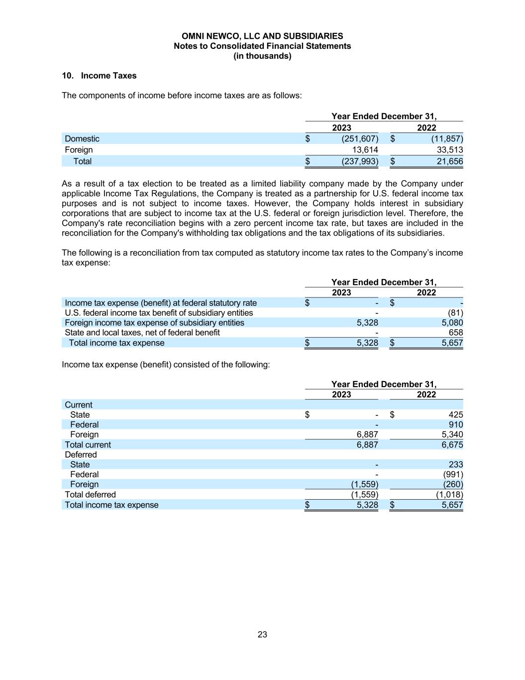 OMNI NEWCO, LLC AND SUBSIDIARIES Notes to Consolidated Financial Statements (in thousands) 23 10. Income Taxes The components of income before income taxes are as follows: Year Ended December 31, 2023 2022 Domestic $ (251,607) $ (11,857) Foreign 13,614 33,513 Total $ (237,993) $ 21,656 As a result of a tax election to be treated as a limited liability company made by the Company under applicable Income Tax Regulations, the Company is treated as a partnership for U.S. federal income tax purposes and is not subject to income taxes. However, the Company holds interest in subsidiary corporations that are subject to income tax at the U.S. federal or foreign jurisdiction level. Therefore, the Company's rate reconciliation begins with a zero percent income tax rate, but taxes are included in the reconciliation for the Company's withholding tax obligations and the tax obligations of its subsidiaries. The following is a reconciliation from tax computed as statutory income tax rates to the Company’s income tax expense: Year Ended December 31, 2023 2022 Income tax expense (benefit) at federal statutory rate $ - $ - U.S. federal income tax benefit of subsidiary entities - (81) Foreign income tax expense of subsidiary entities 5,328 5,080 State and local taxes, net of federal benefit - 658 Total income tax expense $ 5,328 $ 5,657 Income tax expense (benefit) consisted of the following: Year Ended December 31, 2023 2022 Current State $ - $ 425 Federal - 910 Foreign 6,887 5,340 Total current 6,887 6,675 Deferred State - 233 Federal - (991) Foreign (1,559) (260) Total deferred (1,559) (1,018) Total income tax expense $ 5,328 $ 5,657