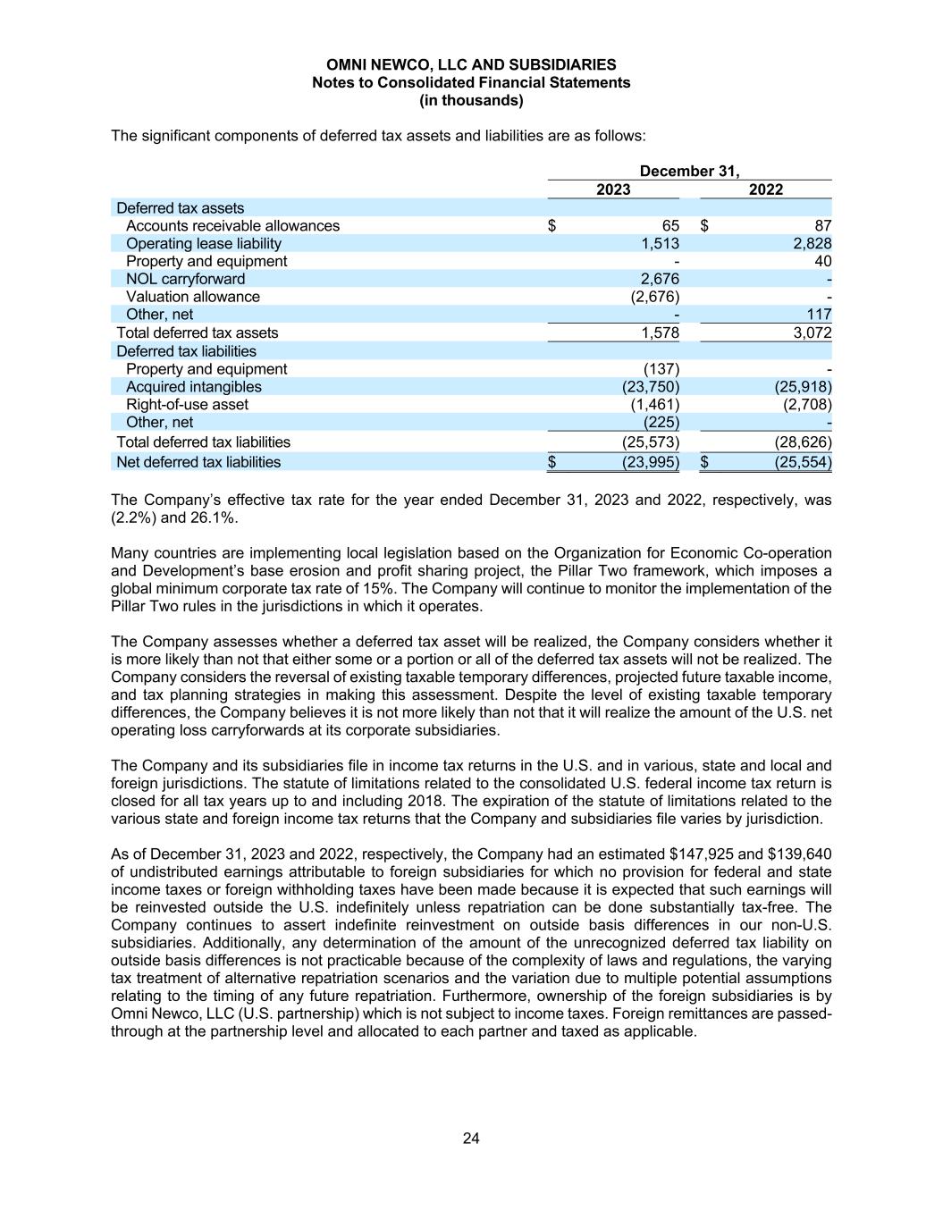 OMNI NEWCO, LLC AND SUBSIDIARIES Notes to Consolidated Financial Statements (in thousands) 24 The significant components of deferred tax assets and liabilities are as follows: December 31, 2023 2022 Deferred tax assets Accounts receivable allowances $ 65 $ 87 Operating lease liability 1,513 2,828 Property and equipment - 40 NOL carryforward 2,676 - Valuation allowance (2,676) - Other, net - 117 Total deferred tax assets 1,578 3,072 Deferred tax liabilities Property and equipment (137) - Acquired intangibles (23,750) (25,918) Right-of-use asset (1,461) (2,708) Other, net (225) - Total deferred tax liabilities (25,573) (28,626) Net deferred tax liabilities $ (23,995) $ (25,554) The Company’s effective tax rate for the year ended December 31, 2023 and 2022, respectively, was (2.2%) and 26.1%. Many countries are implementing local legislation based on the Organization for Economic Co-operation and Development’s base erosion and profit sharing project, the Pillar Two framework, which imposes a global minimum corporate tax rate of 15%. The Company will continue to monitor the implementation of the Pillar Two rules in the jurisdictions in which it operates. The Company assesses whether a deferred tax asset will be realized, the Company considers whether it is more likely than not that either some or a portion or all of the deferred tax assets will not be realized. The Company considers the reversal of existing taxable temporary differences, projected future taxable income, and tax planning strategies in making this assessment. Despite the level of existing taxable temporary differences, the Company believes it is not more likely than not that it will realize the amount of the U.S. net operating loss carryforwards at its corporate subsidiaries. The Company and its subsidiaries file in income tax returns in the U.S. and in various, state and local and foreign jurisdictions. The statute of limitations related to the consolidated U.S. federal income tax return is closed for all tax years up to and including 2018. The expiration of the statute of limitations related to the various state and foreign income tax returns that the Company and subsidiaries file varies by jurisdiction. As of December 31, 2023 and 2022, respectively, the Company had an estimated $147,925 and $139,640 of undistributed earnings attributable to foreign subsidiaries for which no provision for federal and state income taxes or foreign withholding taxes have been made because it is expected that such earnings will be reinvested outside the U.S. indefinitely unless repatriation can be done substantially tax-free. The Company continues to assert indefinite reinvestment on outside basis differences in our non-U.S. subsidiaries. Additionally, any determination of the amount of the unrecognized deferred tax liability on outside basis differences is not practicable because of the complexity of laws and regulations, the varying tax treatment of alternative repatriation scenarios and the variation due to multiple potential assumptions relating to the timing of any future repatriation. Furthermore, ownership of the foreign subsidiaries is by Omni Newco, LLC (U.S. partnership) which is not subject to income taxes. Foreign remittances are passed- through at the partnership level and allocated to each partner and taxed as applicable.
