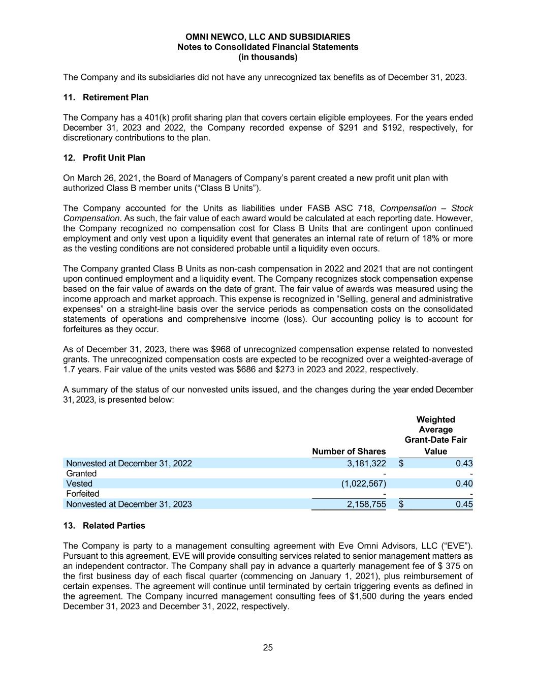 OMNI NEWCO, LLC AND SUBSIDIARIES Notes to Consolidated Financial Statements (in thousands) 25 The Company and its subsidiaries did not have any unrecognized tax benefits as of December 31, 2023. 11. Retirement Plan The Company has a 401(k) profit sharing plan that covers certain eligible employees. For the years ended December 31, 2023 and 2022, the Company recorded expense of $291 and $192, respectively, for discretionary contributions to the plan. 12. Profit Unit Plan On March 26, 2021, the Board of Managers of Company’s parent created a new profit unit plan with authorized Class B member units (“Class B Units”). The Company accounted for the Units as liabilities under FASB ASC 718, Compensation – Stock Compensation. As such, the fair value of each award would be calculated at each reporting date. However, the Company recognized no compensation cost for Class B Units that are contingent upon continued employment and only vest upon a liquidity event that generates an internal rate of return of 18% or more as the vesting conditions are not considered probable until a liquidity even occurs. The Company granted Class B Units as non-cash compensation in 2022 and 2021 that are not contingent upon continued employment and a liquidity event. The Company recognizes stock compensation expense based on the fair value of awards on the date of grant. The fair value of awards was measured using the income approach and market approach. This expense is recognized in “Selling, general and administrative expenses” on a straight-line basis over the service periods as compensation costs on the consolidated statements of operations and comprehensive income (loss). Our accounting policy is to account for forfeitures as they occur. As of December 31, 2023, there was $968 of unrecognized compensation expense related to nonvested grants. The unrecognized compensation costs are expected to be recognized over a weighted-average of 1.7 years. Fair value of the units vested was $686 and $273 in 2023 and 2022, respectively. A summary of the status of our nonvested units issued, and the changes during the year ended December 31, 2023, is presented below: Number of Shares Weighted Average Grant-Date Fair Value Nonvested at December 31, 2022 3,181,322 $ 0.43 Granted - - Vested (1,022,567) 0.40 Forfeited - - Nonvested at December 31, 2023 2,158,755 $ 0.45 13. Related Parties The Company is party to a management consulting agreement with Eve Omni Advisors, LLC (“EVE”). Pursuant to this agreement, EVE will provide consulting services related to senior management matters as an independent contractor. The Company shall pay in advance a quarterly management fee of $ 375 on the first business day of each fiscal quarter (commencing on January 1, 2021), plus reimbursement of certain expenses. The agreement will continue until terminated by certain triggering events as defined in the agreement. The Company incurred management consulting fees of $1,500 during the years ended December 31, 2023 and December 31, 2022, respectively.